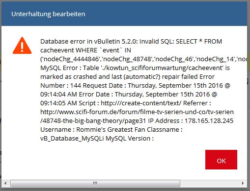 [QUOTEDatabase error in vBulletin 5.2.0: Invalid SQL: SELECT * FROM cacheevent WHERE `event` IN ('nodeChg_4444862','nodeChg_4424129','nodeChg_29','nodeChg_16','nodeChg_2','nodeChg_1'); MySQL Error : Table './kowtun_scififorumwartung/cacheevent' is marked as crashed and last (automatic?) repair failed Error Number : 144 Request Date : Thursday, September 15th 2016 @ 12:12:36 PM Error Date : Thursday, September 15th 2016 @ 12:12:37 PM Script : http:///create-content/text/ Referrer : http://www.scifi-forum.de/forum/inte...probleme/page9 IP Address : 188.102.193.216 Username : Anvil Classname : vB_Database_MySQLi MySQL Version :][/QUOTE]