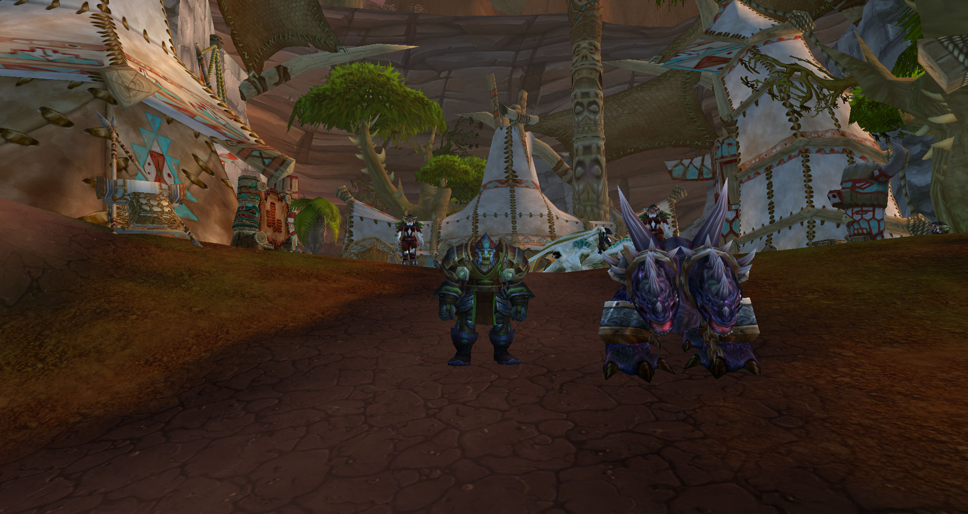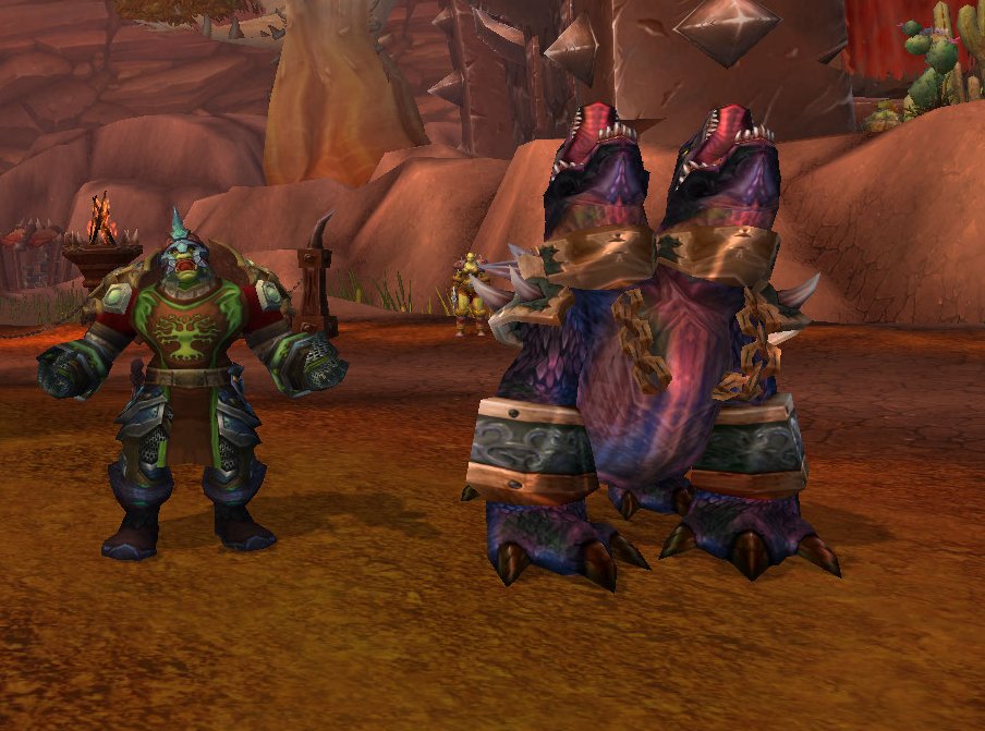 2. Ich mit 85 im neuen Tauren-Distrikt von Orgrimmar. Achtet mal genau auf die grauen Außenmauern. Die Tauren haben ihr Viertel mitten in den Grundmauern von Thralls alter Festung errichtet, die vor dem Weltenbeben an der selben Stelle stand. Das Vieh neben mir ist der gezähmte Chromaggus aus dem alten Pechschwingenhort.