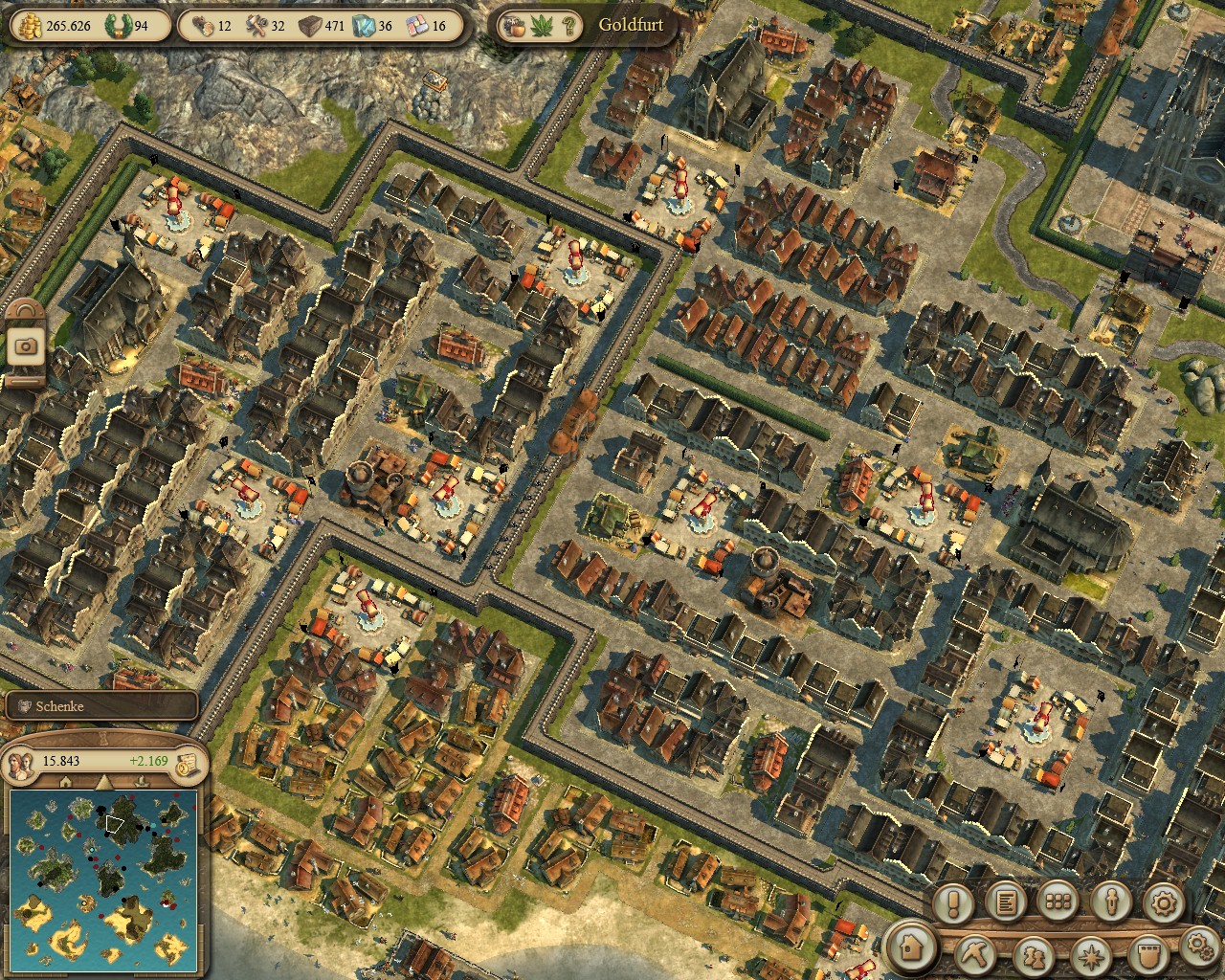 Heute hat meine größte orientalische Stadt den Status "Weltstadt" (10.000 Gesandte) erhalten. Und das, obwohl ich mir die Insel mit einem KI-Spieler teilen muss. Meine okzidentalische Hauptstadt stagniert schon seit langem bei 6.000 Adligen und 5.000 Patriziern. Mehr geht auch nicht. Bis auf drei Betriebe am Fluss und drei Endproduktionen (Brokatgewänder), befinden sich keinerlei Produktionsstädten dort. Die Inseln sind einfach zu klein, obwohl ich sie vor dem Spiel größtmöglich gewählt habe.