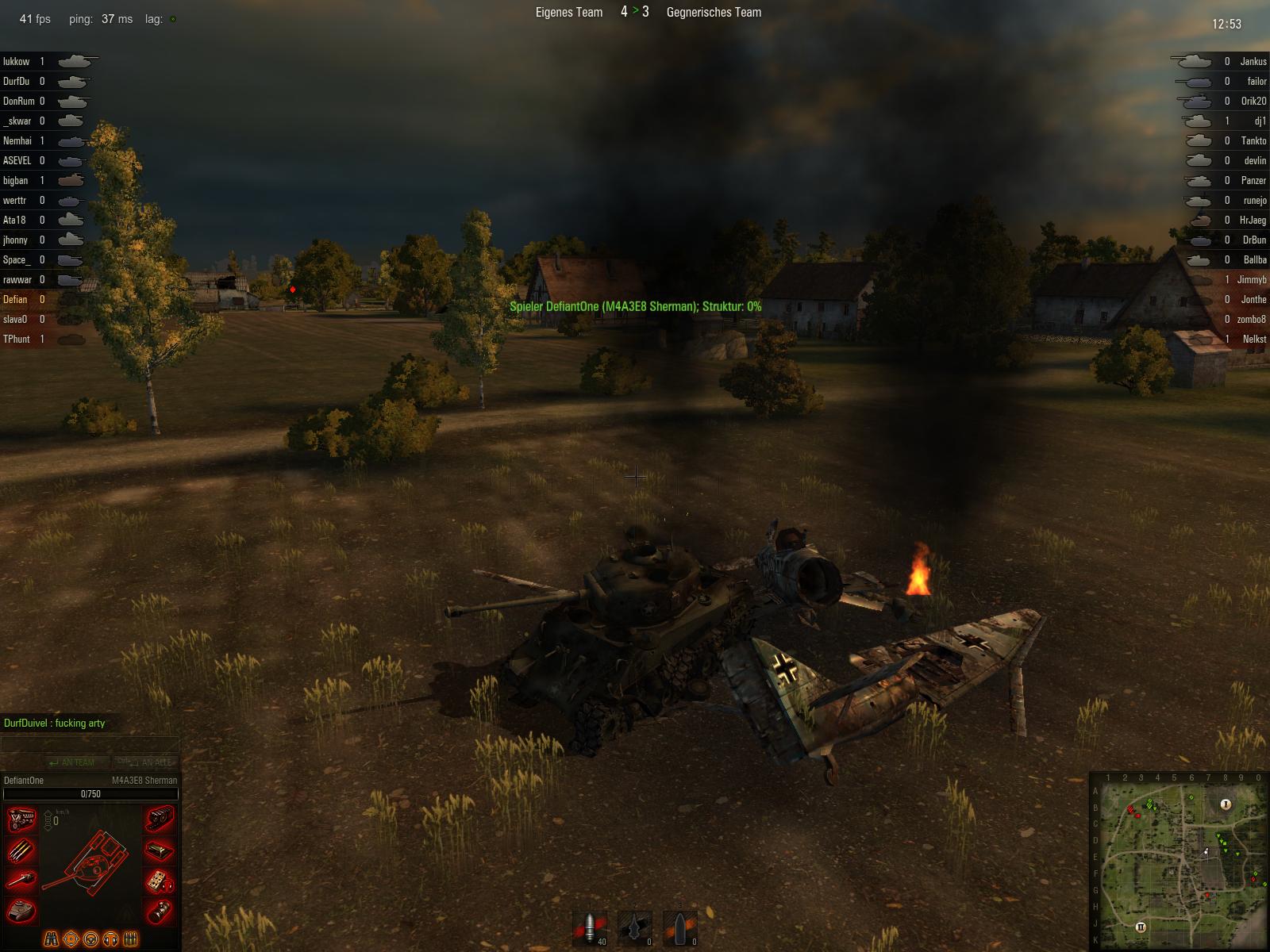 Eben ist mir wieder was witziges(merkwürdiges?)passiert. Ich war auf Murowanka, am nördlichen Startpunkt. Sowie das Spiel anfing, drückte ich die Vorwärts-Taste und wunderte mich nicht schlecht, als ich dann einige Sekunden später nicht mehr lenken konnte und der E8 von alleine vorwärts fuhr. Das Gleiche hatte ich schön desöfteren, andere hier haben das Problem auch bereits mehrmals gehabt, wenn ich mich recht erinnere. So fuhr ich dann vorwärts, bis ich auf dieses Kampfflieger-Wrack aufgefahren bin. Da konnte ich dann auf einmal wieder lenken, steckte dann aber in diesem Flugzeug-Wrack fest, bis mich ein Gegner abgeschossen hat. Ich konnte mich winden wie ich wollte, ich kam da nicht mehr raus