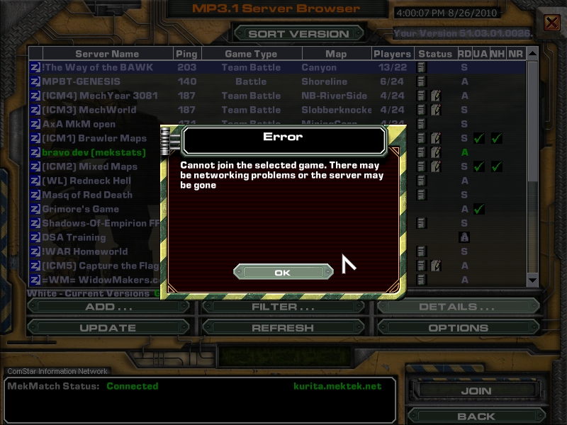 Ich hab mir über mektek Mechwarrior Mercenaries downgeloaded,aber ich kann mich mit keinem einzigen Server verbinden.Es kommt immer die Meldung das es entweder ein Netzwerkproblem ist oder der Server down sein,was aber nicht sein kann,zumindest nicht das alle Server down sind,da in der Serverliste Spieler angezeigt werden.