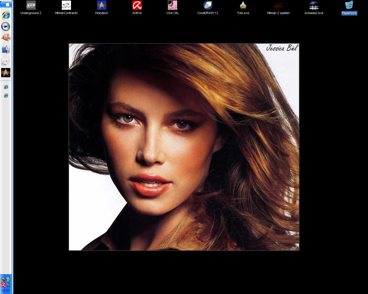 Seit Monaten hab ich meinen Desktop mit diesem Bild belegt...ist eigerntlich sehr ungewöhnlich, denn ich langweile mich sehr schnell, und muss ständig ein neues Bild reinsetzen...aber dieses Bild...von Jessica Biel finde ich faszinierend...unglaublich klar und perfekt...mit vielen Facetten und Farbvariationen, starken Kontrasten usw...es beruhigt irgendwie meinen Geist...manschmal sitze ich einfach nur vor dem Schirm und sehe in ihre tiefgünblauen Augen...