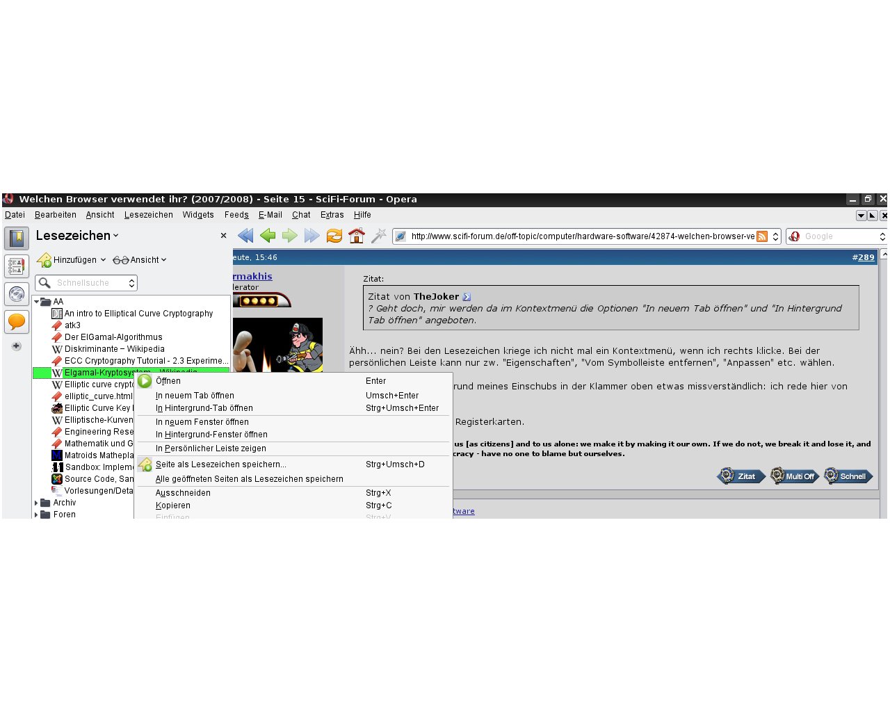 Aber warum sollte ich im Opera rechtsklicken und "In neuen Tab öffnen" wollen, wenn ich einfach den Button in die TabLeiste ziehen kann? [...] Ich meine nur, es gibt schnellere Wege im Opera als Rechstklick.