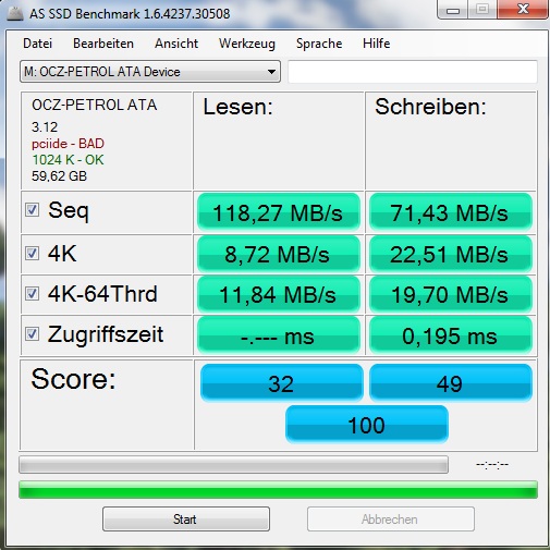Habe mir die Woche als Ersatz für meine gecrashte HDD in Acer Notebook Ferrari eine OCZ Petrol 64GB geholt. Habe Linux Mint 13 drauf installiert und es wird ab Powerknopf in sagenhaften 5 Sekunden bis Desktop gestartet.