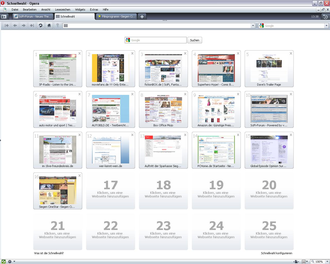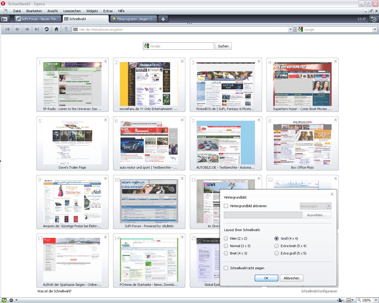 Individuell, also typisch für Opera, kann ich nun je nach Wunsch und Bildschirmformat (4:3, 16:9) 2x2, 3x3, 4x3, 4x4, 5x4 oder 5x5 Vorschau-Tabs also Schnellwahlfenster, also bis zu 25 solcher Schnellanwahlen erstellen! Einfach klasse!