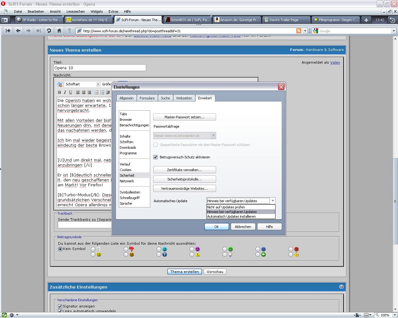 Auto-Update: Zugegeben, Firefox macht das schon lange so. Aber Firefox fragt auch nicht nach. Opera hat jetzt eine Auto-Updatefunktion. Auch diese ist wieder individuell einstellbar: Man kann sie ganz ausschalten. Sie kann als Benachrichtigung eingestellt werden, so dass man dann, wenn man es denn dann will, mal grad das Update machen kann oder man kann's so einstellen, dass Opera jedes Update sofort selber installiert. Keine Innovation, klar. Aber eine Neuerung, die in diese Liste gehört.