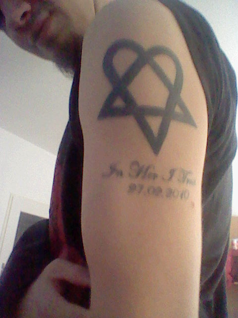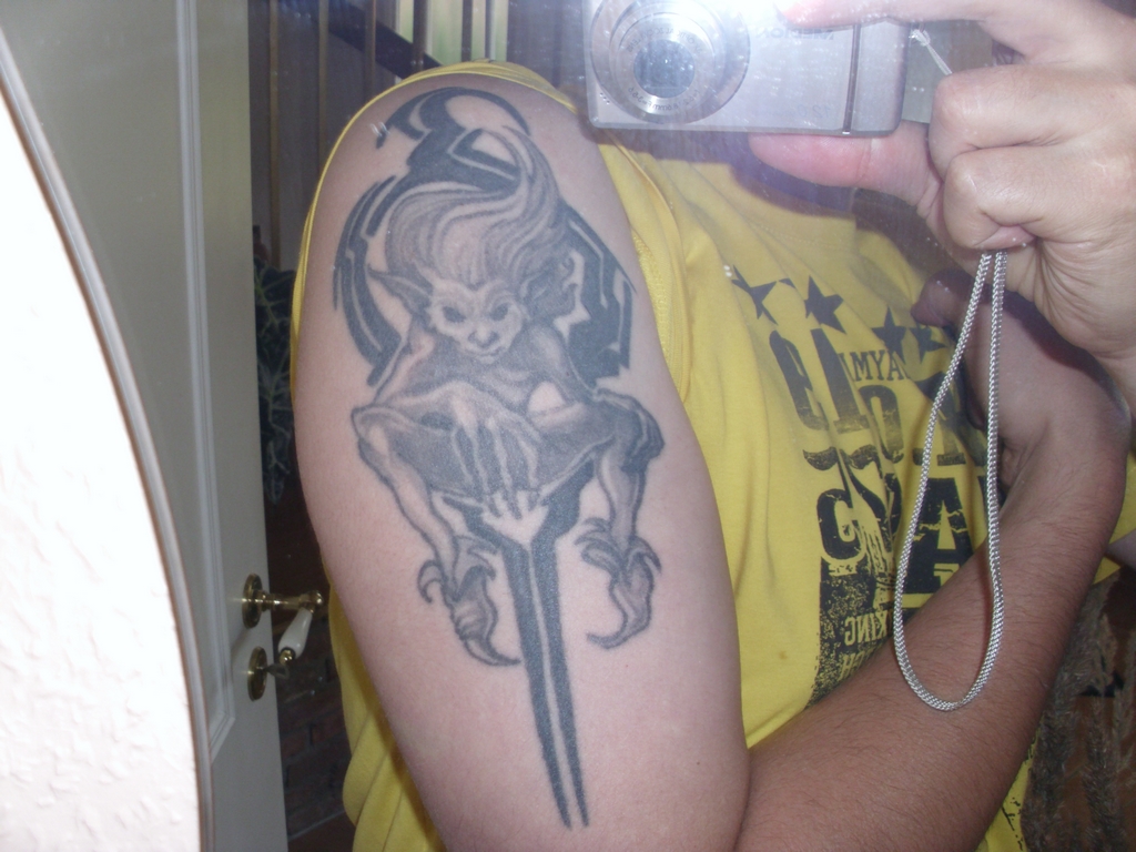 Ich habe 5 Tattoos, je 2 auf dem rechten ( Metallicastern und Stoneszunge ) und dem linken ( Indianerkopf und Manowarschriftzug ) Oberarm und eins auf dem rechten Schulterblatt ( Tiger ).