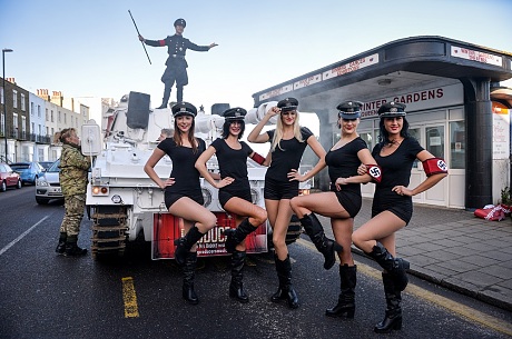 Das dachte sich auch Mel Brooks, und hat vor Ort ein bißchen Werbung für sein neues Musical gemacht. Passend (zur Ukip) und stilecht mit Panzer und Uniformen: