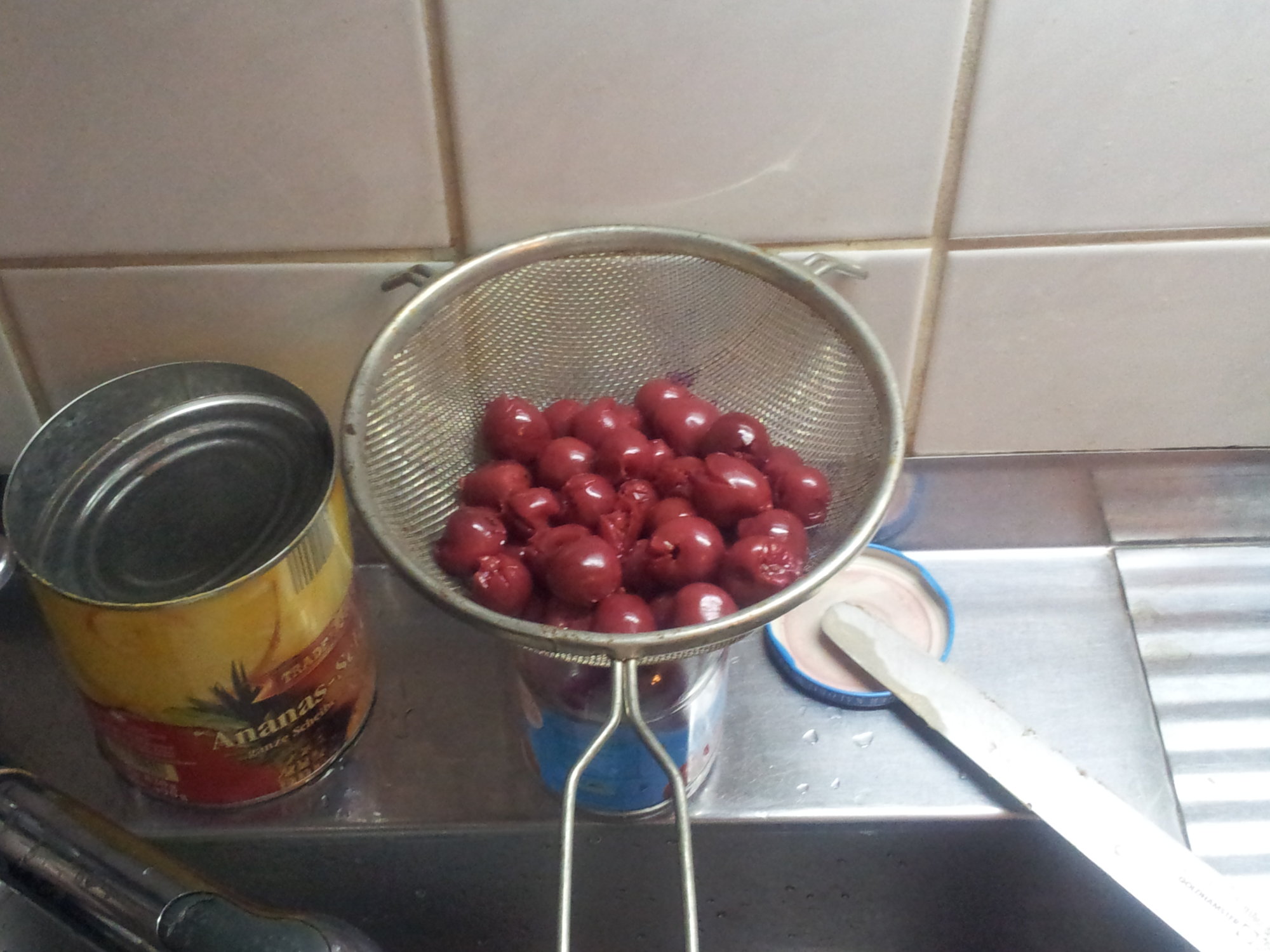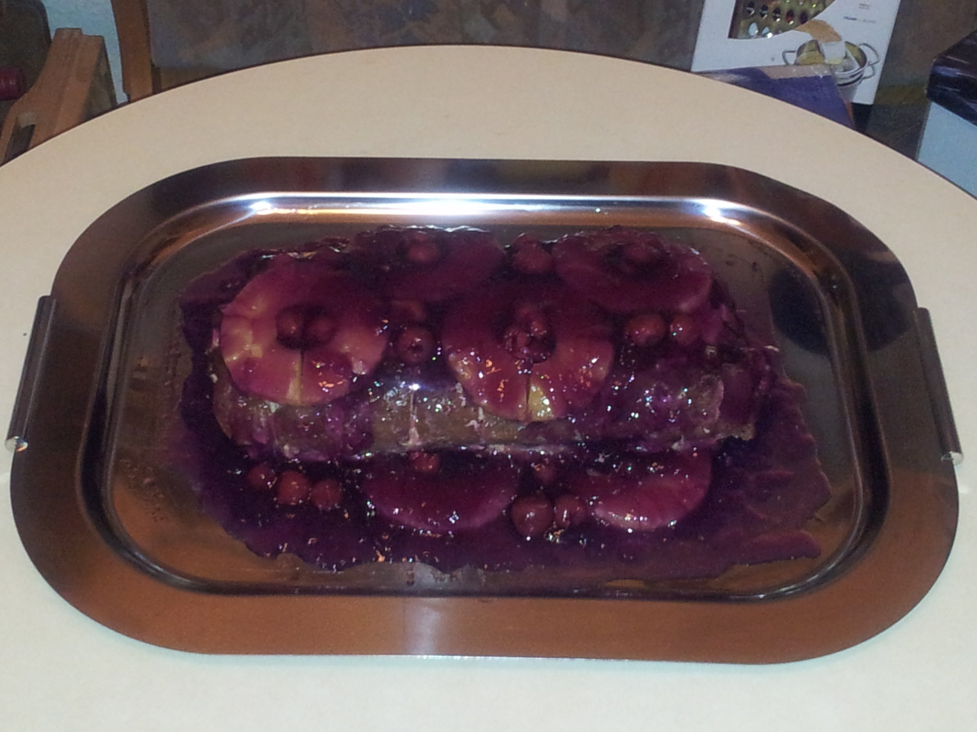 Mit Schattenmorellen, Ananas dekorieren, mit Aspik überziehen, kühl durchziehen lassen.