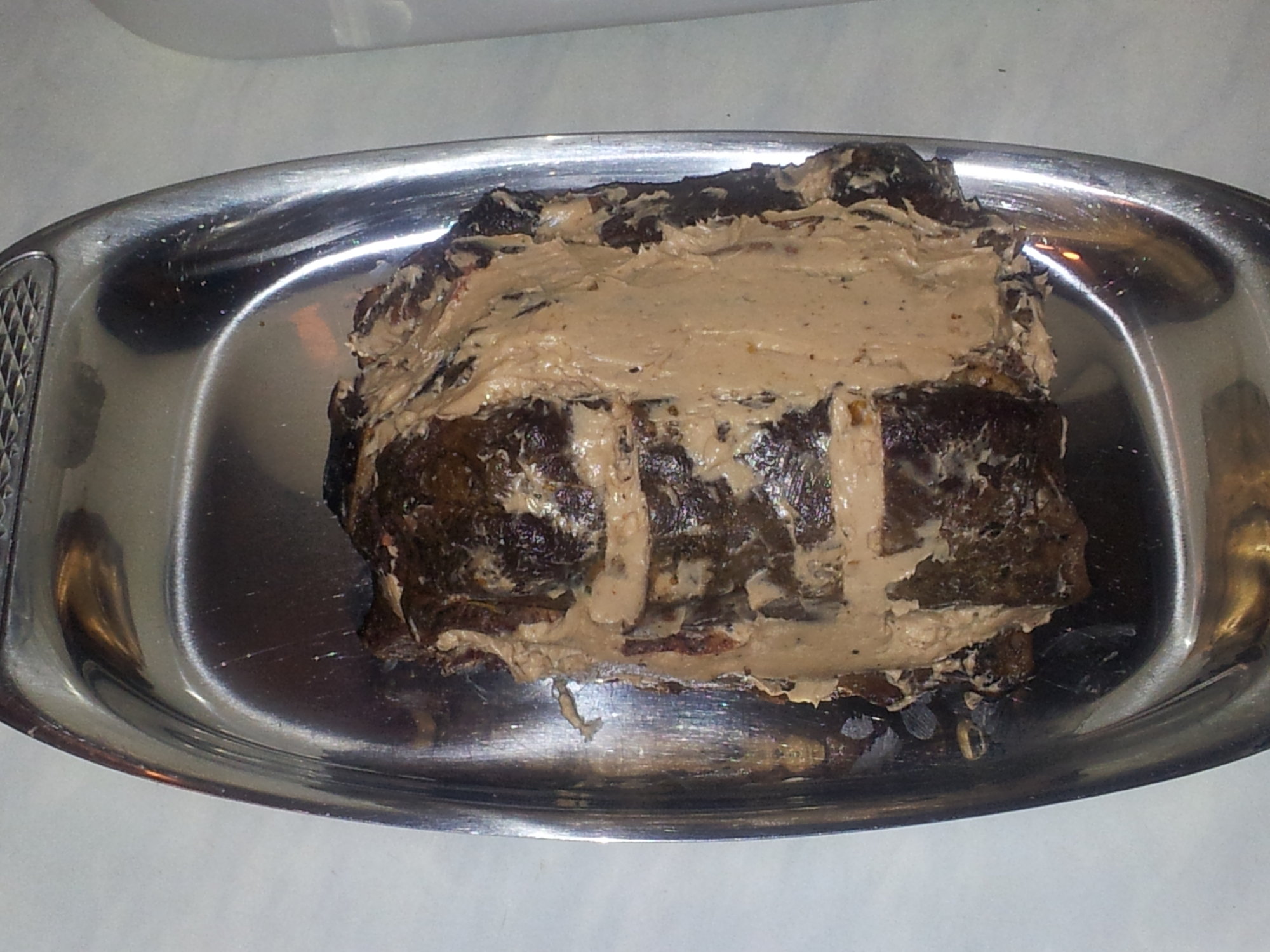 Danach wurde es pariert und auf Brätergröße gebracht, gespickt und das Fleisch leicht vom Knochen (Rückrand) gelöst.