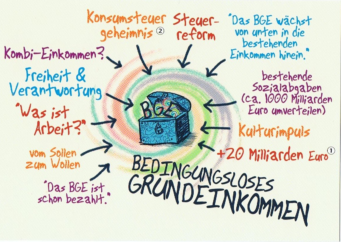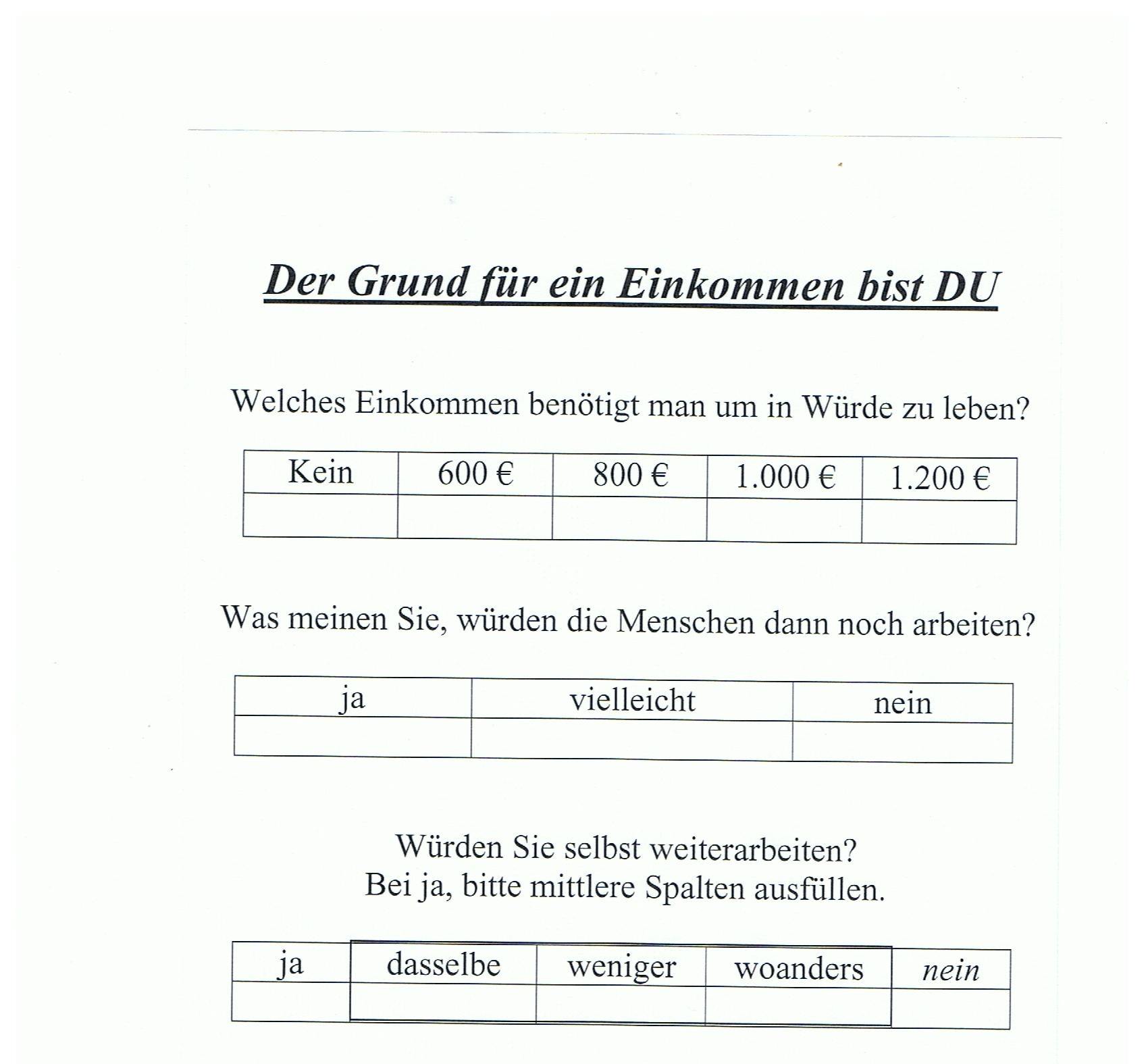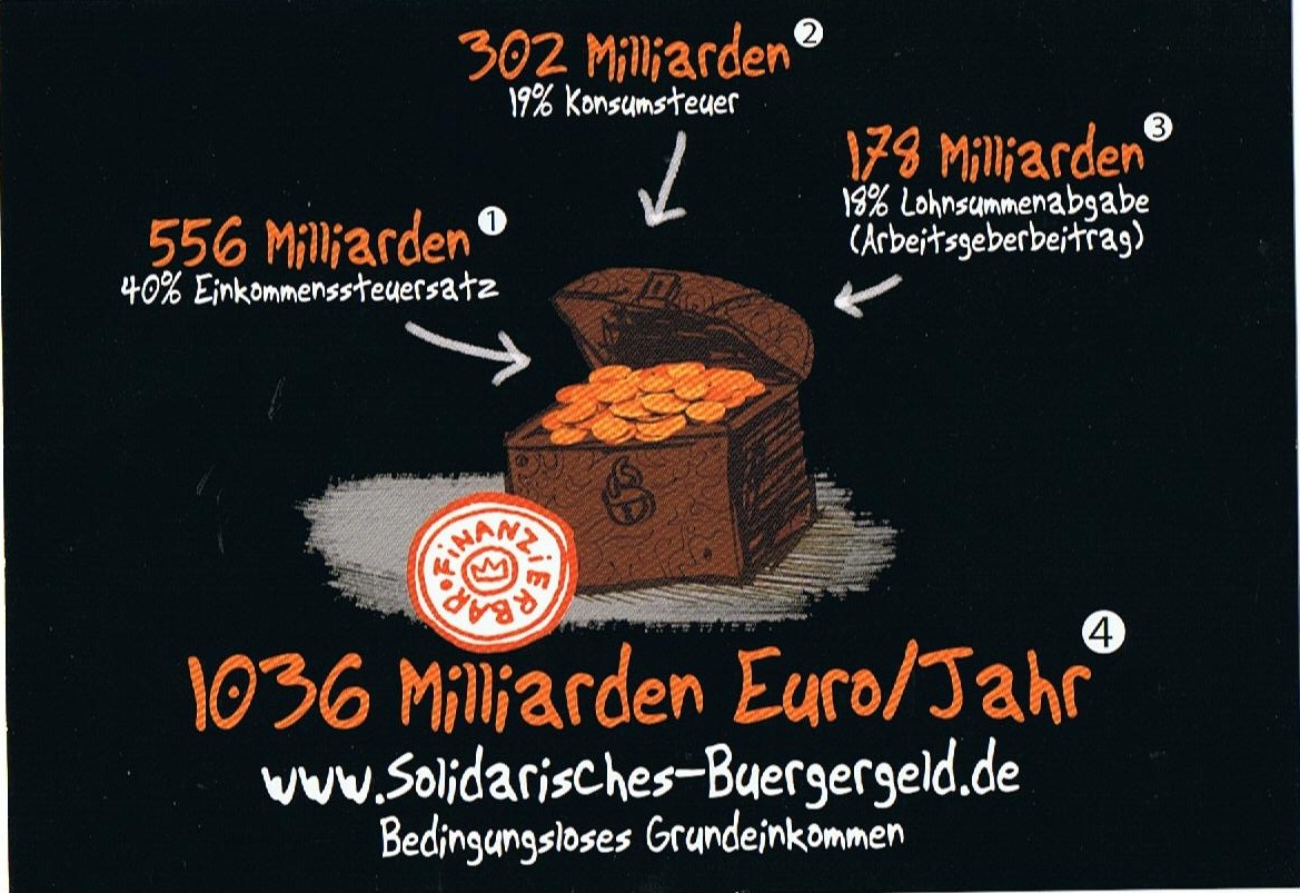 Götz Werner hat das anders heruntergerechnet (am Beispiel Deutschland). Wenn man die 1 Billion Sozialleistungen (von Schäuble berechnet) herunterrechnet, kommt man damit auf ein bisschen mehr als 1000€ im Monat. Theoretisch könnte man durch Eintausch der Sozialleistungen das Einkommen finanzieren.