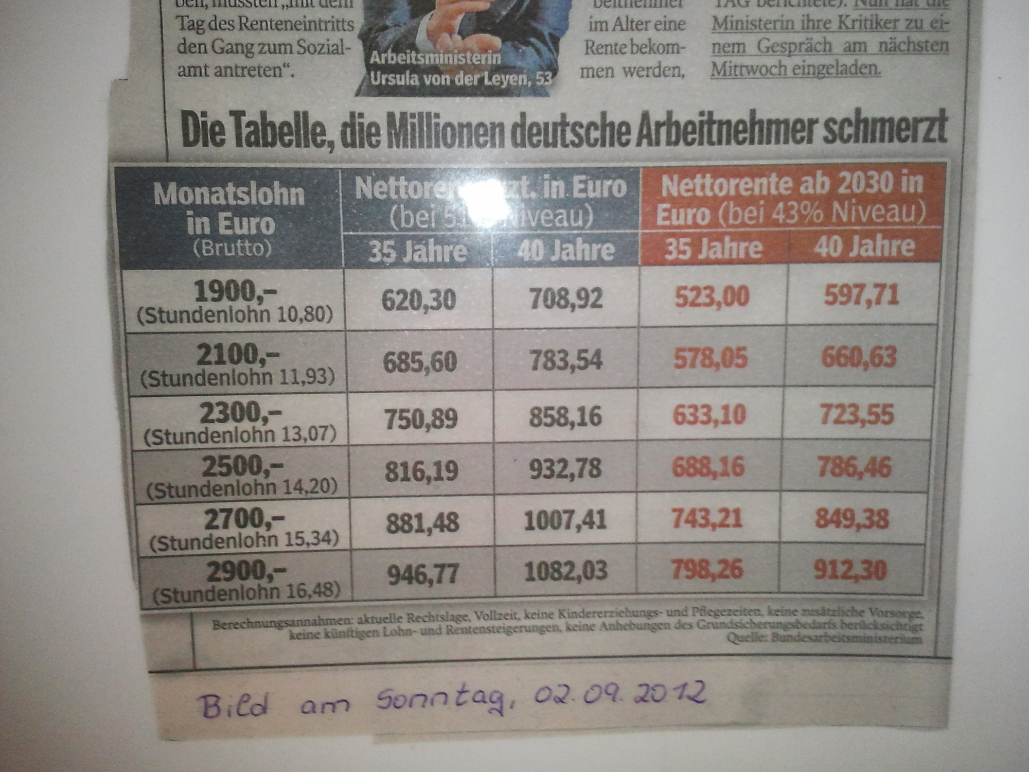 Komisch ist auch das viele Arbeitgeber auch von groß Firmen so wie aber auch kleine Betriebe für ein Einkommen sind. Den die begreifen das sie was haben davon. Den sie könnten doch sagen: "wenn meine Mitarbeiter 800 oder 1000 Euro in Monat bekommen einfach so, da kommen die doch nicht mehr Arbeiten."