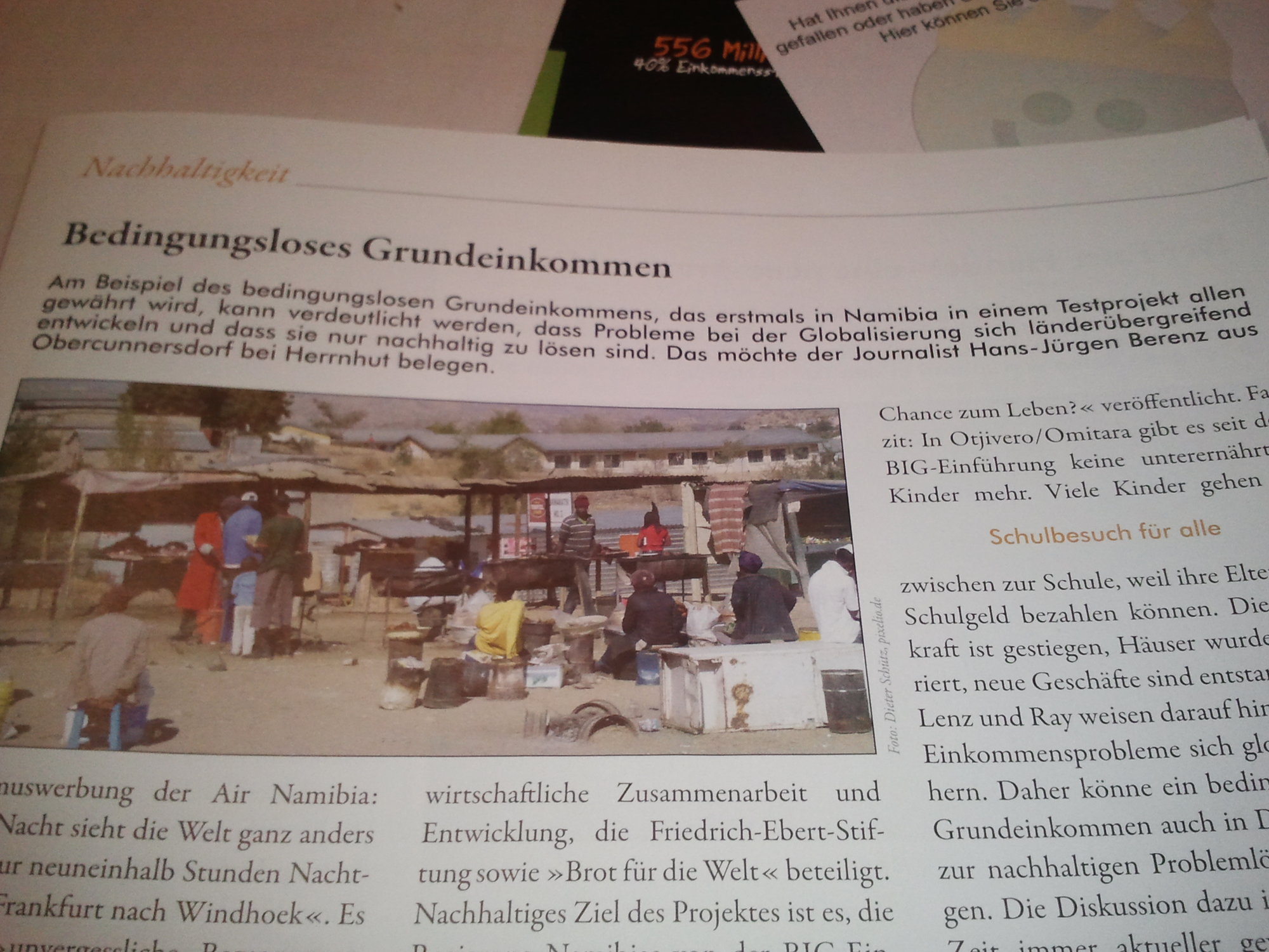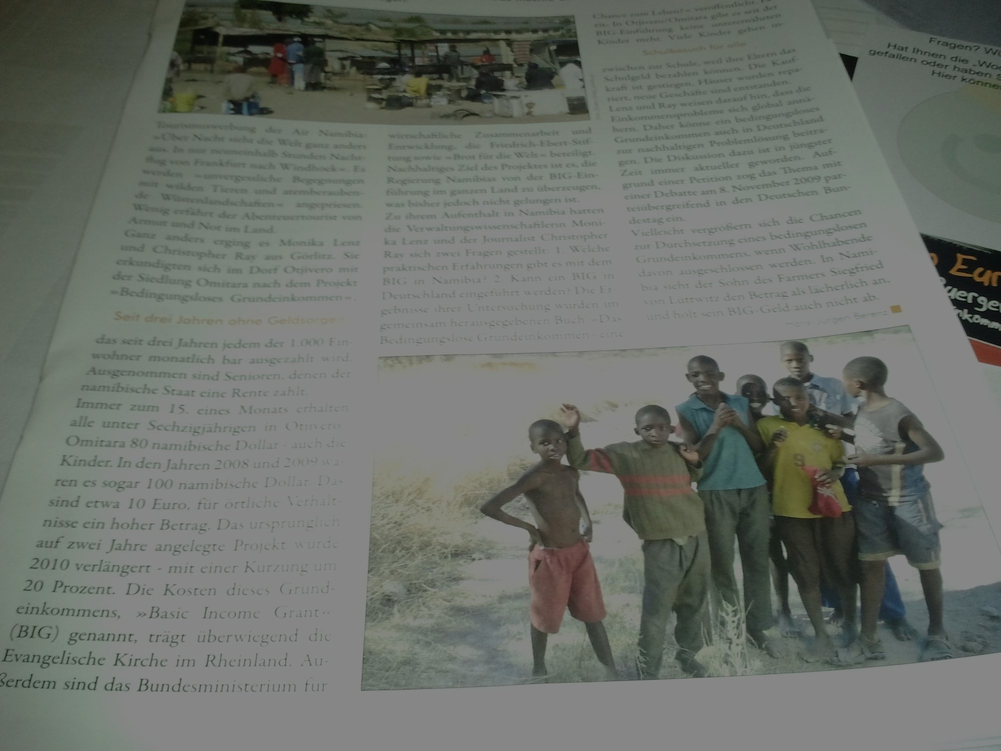 Außerdem hat schon mal einer was von Namibia wo es über die Rheinland Evangelische Kirsche so ein Projekt mit unterstützt wird. Wo dort seit Jahren am 15 Monatstag 100 Namibische Dolar (umgerechnet 10 Euro) die Leute in ein Dorf dort als Grundeinkommen bekommen und man so zusagen dieses Projekt der Einführung da beobachtet. 10 Euro ist dort viel Geld am Tag.