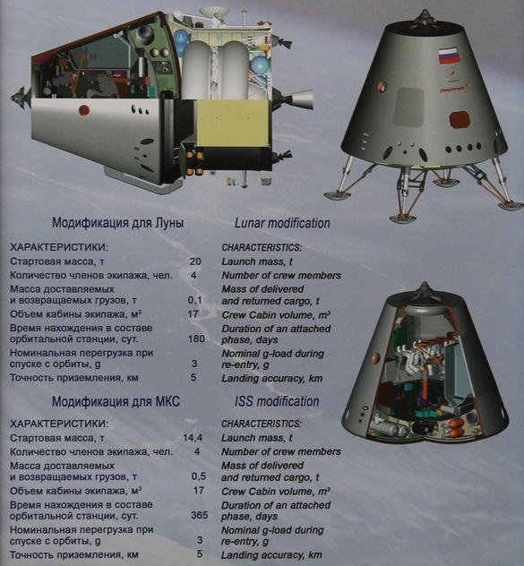 Auf der diesjährigen MAKS wurde der Entwurf für den mondflugfähigen Sojus-Nachfolger vorgestellt. Damit soll wahlweise der LEO oder der Mond mit bis zu 4 Crewmitgliedern angeflogen werden.
