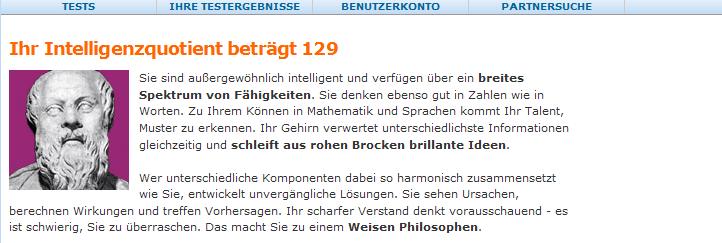 Lt. dem Ergebnis bin ich "außergewöhnlich intelligent", naja, denk schon dass ich nicht gerade ein Idiot bin, aber aussergewöhnlich intelligent heisst für mich definitiv etwas anderes. Bin zB in Mathe eine absolute Niete. Meine Schulnoten waren zwar nie schlecht, aber sicherlich auch nicht aussergewöhnlich gut. Daher sind solche Tests für mich höchstens ein vager Indikator, so dass man vielleicht sagen kann jemand der regelmäßig 100 erreicht, hat eventuell eine nicht ganz so schnelle Auffassungsgabe als jemand der 140 (wie Tomalak - die Intelligenzbestie ;-)) schafft (oder demjenigen fehlt das Interesse sich überhaupt intellektuellen Herausforderungen zu stellen, was ja noch lange nicht heissen muss der oder diejenige ist minder intelligent), aber niemand kann behaupten dass ich mit meinen 9 Punkten ntelligenter als Skymarshal bin. Das kann man aufgrund solcher Tests nie sagen weil einfach viel zu viele unbekannte Faktoren, und ich denke auch etwas Glück in der Auswahl der Fragen, einen Rolle spielen.