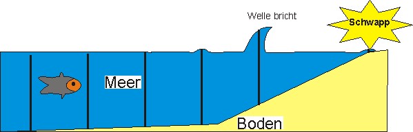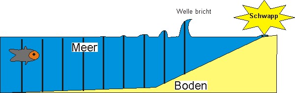 Also: sichtbare "Wasserwelle" (ugs.) = Schwingung; Fortbewegung der "Wasserwelle" geschieht aufgrund der eigentlichen Welle