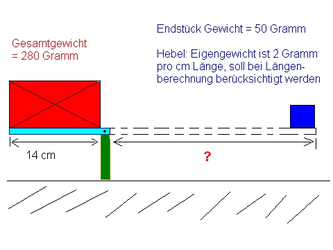 Der Hebel wäre nun ja recht leicht zu berechnen, jedoch soll hier auf der rechten Seite das Eigengewicht des Hebels mit einberechnet werden, und das einzige bekannte dazu ist, das der Hebel pro cm Länge 2 Gramm wiegt (z.B. 10 cm Hebel dann entsprechend 20 Gramm).