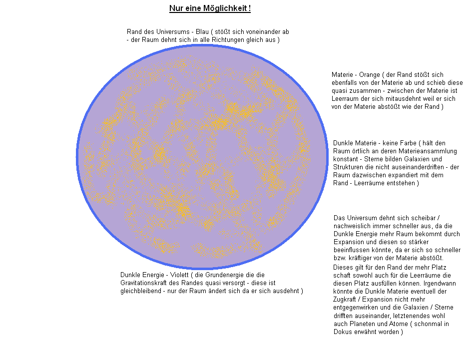 stellt man sich nun vor das universum ist eine kugel oder ein luftballon, dessen ränder sich also gegenseitig abstoßen. Innen sind gummibänder mit perlen ( galaxien ) die den raum darstellen. den lunftballon pustet man auf ( dunkle energie treibt den rand auseinander - der raum dehnt sich, die perlen nicht, sie bleiben am selben ort des gummibandes, dennoch entfernen sie sich ( leerräume ) aber die perle selbst bleibt stabil ( dunkle materie / materie / gravitation der massen )