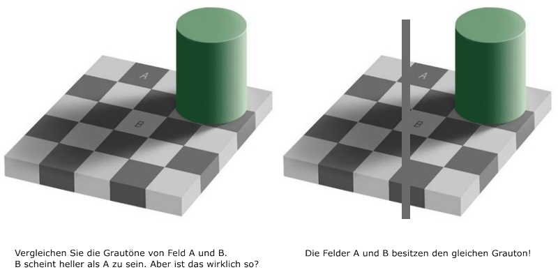 Edit: für dein Beispiel der optischen Täuschung finde ich dieses Bild hier noch besser geeignet, da käme wohl beim ersten Anblick wirklich keiner auf die Idee, das die beiden markierten Felder identische Farben haben: