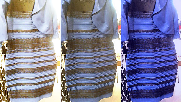 Im Netz geistert meist die linke oder mittlere Variante rum, und die ist dank hundsmieserabler Kamera (und hier und da schlecht kalibrierten Monitoren obendrauf ^.^) eben wirklich nicht mehr in den Originalfarben blau/schwarz sondern zu hellblau bis blaugrau/Gold geworden. Frag ein Grafikprogramm deines Vertrauens, was es dir für Farbcodes bei den Kleiderfarben ausspuckt