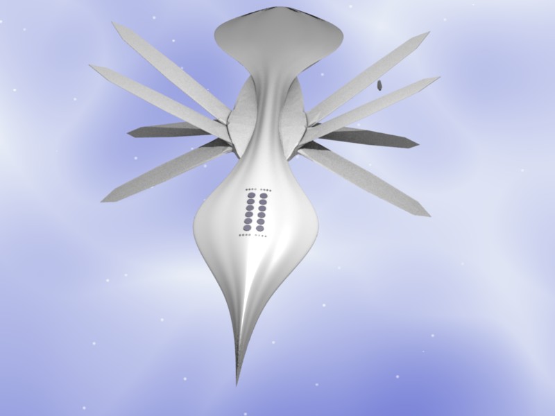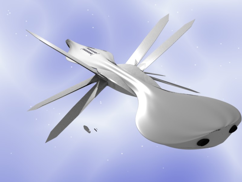 Das Raumfahrzeug und die Umgebung habe ich 'grob' in Cinema modelliert und in Photoshop per digitaler Malerei und Mattepainting Details hinzugefügt. Alles in allem zwei Tage harte Arbeit.