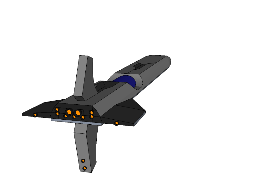 Kurzer Zwischenstand: Die Flossen sind schonmal 3-D, mit dem runden Profil habe ich angefangen. Den Grat auf dem Primärrumpf habe ich erweitert, wenn ich das hinkriege wird der später direkt in den Diskus übergehen.