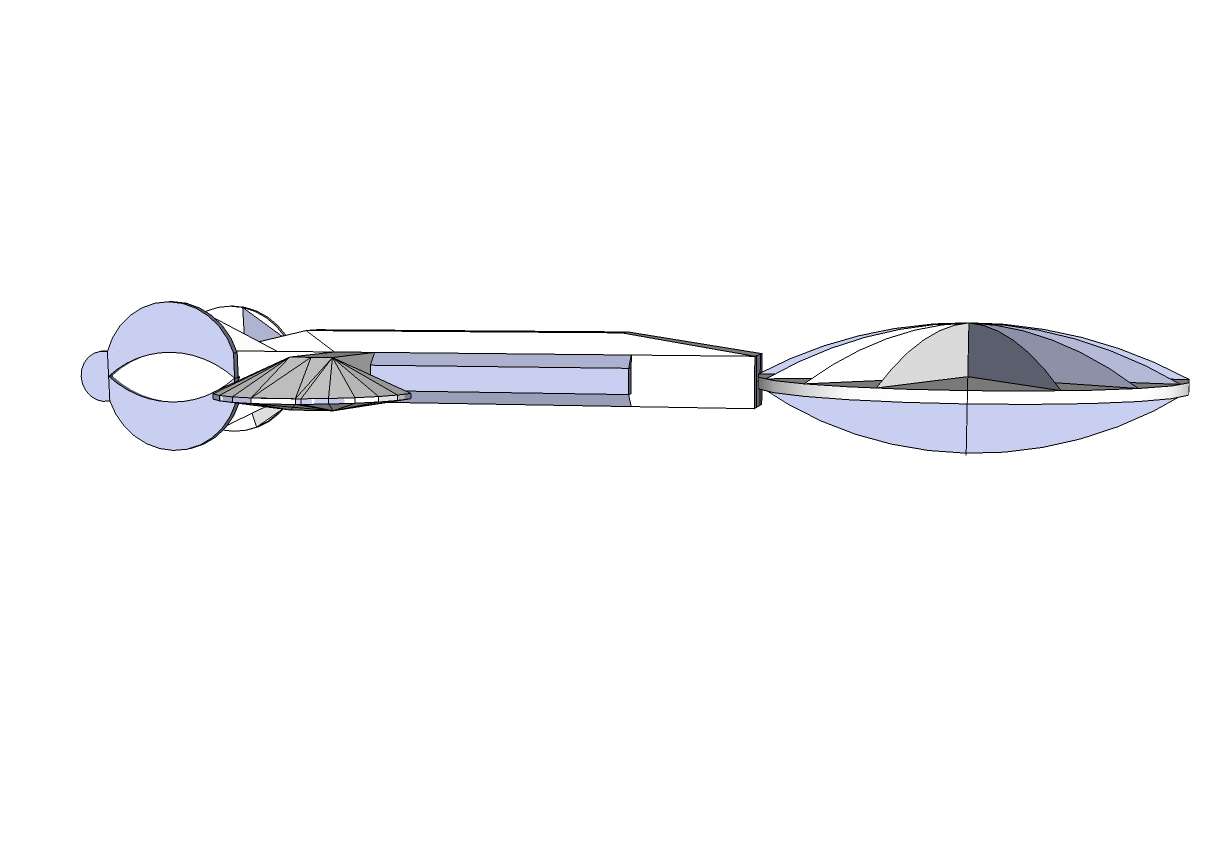 Vorläufiger Endstand: Nachdem ich zu dem Schluss gekommen bin, das der Diskus besonders in der Profilansicht unschön angeflanscht aussieht (Anhang 1) hab ich das ganze nochmal abgeändert. Den Primärrumpf habe ich deutlich verlängert und einen gekippten Halbkreis angefügt. Danach noch ein paar Texturen und das Grundgerüst ist fertig. Das urpsrünglich geplante Verhältnis L/B/H 4:2:1 ist jetzt zwar vor die Hunde gegangen, insgesamt gefällt mir das Ergebnis aber recht gut.