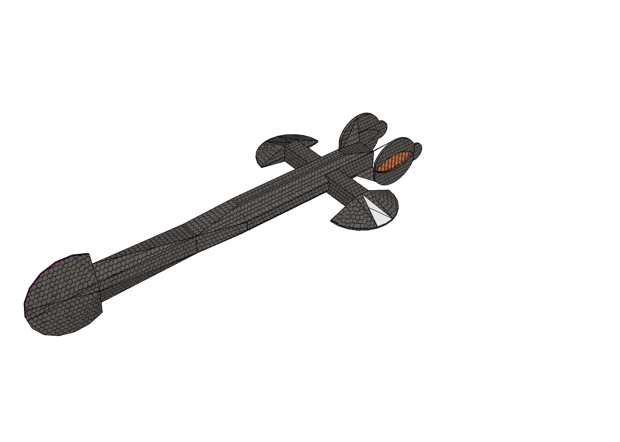 Auf dem Hauptrumpf ist bereits die Fläche zu sehen, auf die ich einen Grat setzen will, in dem die Eskorter andocken sollen. Die Flossen am Heck sind für den gravimetrischen Antrieb, die werden (hoffentlich) noch dreidimensional.