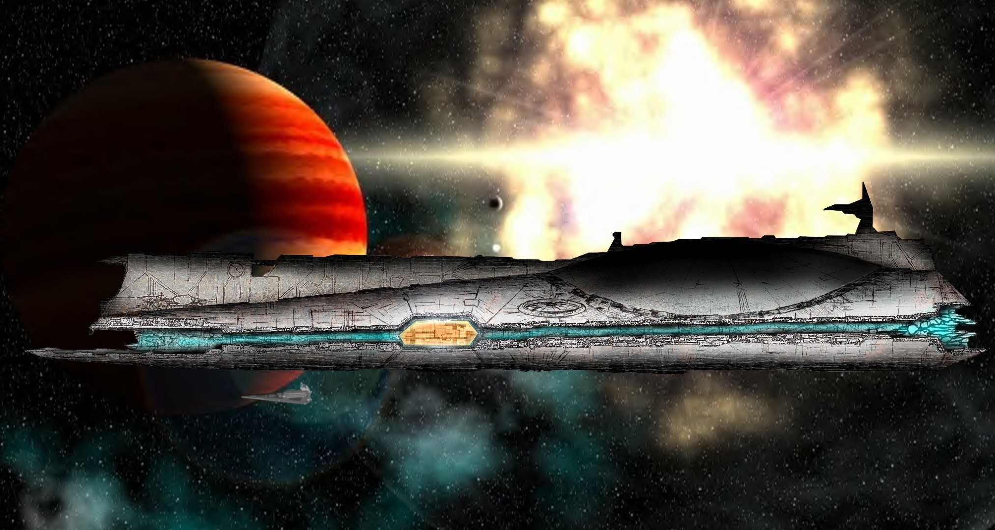 Außerdem hab ich jetzt zwischen den beiden hinteren Platten den Hauptreaktor positioniert mit nem Notfallschott direkt an der Hülle durch dass der Kern im Notall abgeworfen werden kann(mal bitte sagen ob das bei dem LC logisch ist und welche Energieversorgung er haben könnte, plane um dann noch Notenergie zu liefern ein kleines Backupsystem ein)