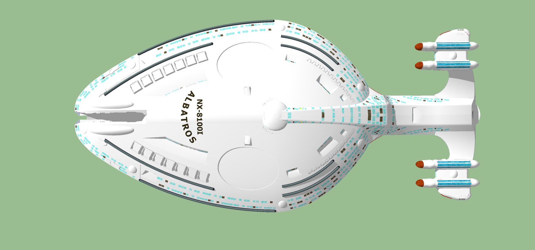 der warpantrieb ist jetzt eine eigenständige einheit. der maschinenraum mit warpkern befindet sich jetzt direkt an den warpgondeln. der warpkern jeweils zwischen den beiden warpgondeln. die form der warpgondeln hat den schiff sein namen gegeben. NX-8100I ALBATROS