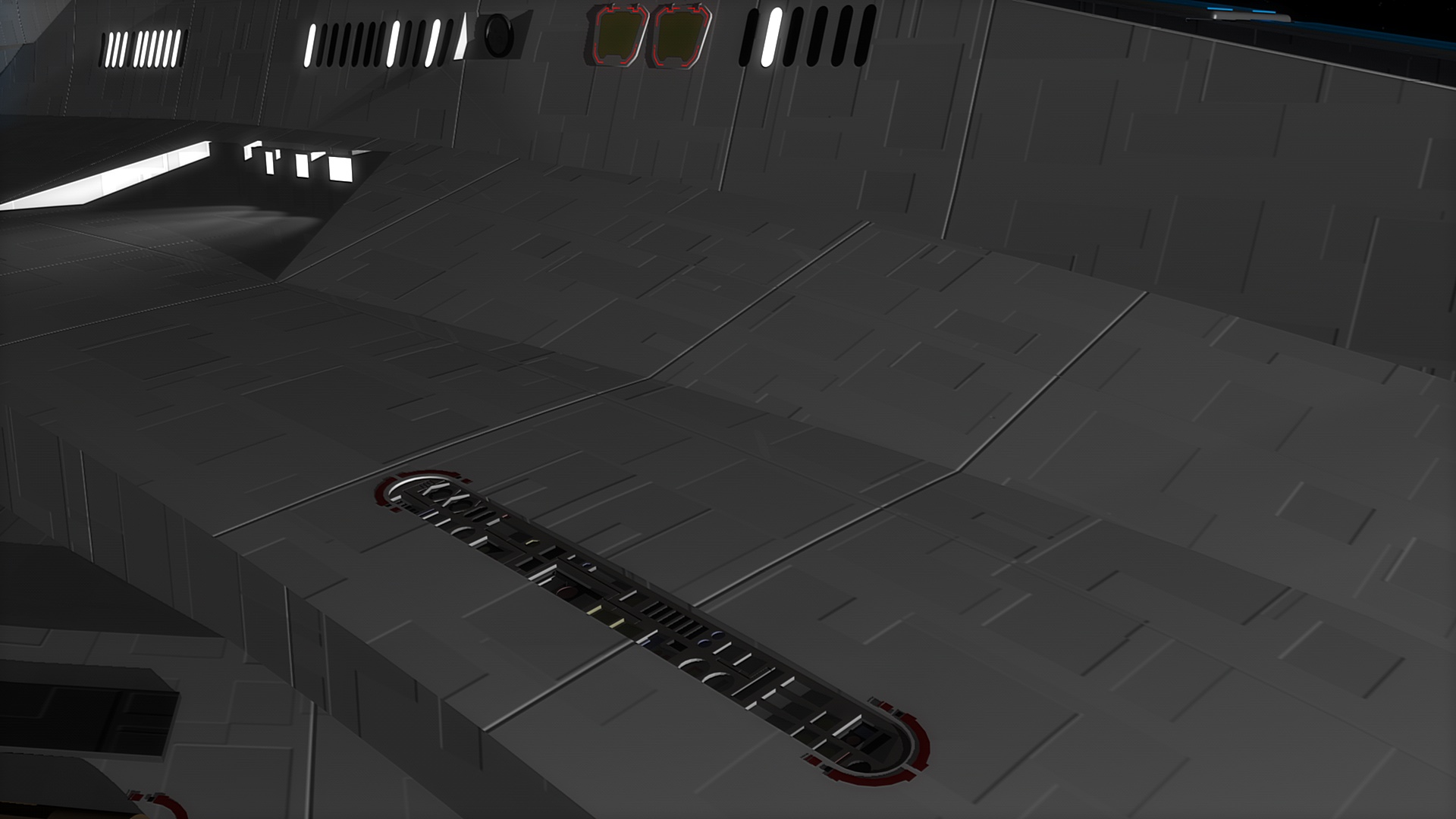 (Anmerkung: Es scheint gang und gäbe zu sein [Unteranmerkung: Woher kommt diese Redewendung eigentlich?], daß man bei Raumschiffen eine Hüllenplatten-Textur verwendet. Dabei ist das gar nicht mal so wirklich logisch.