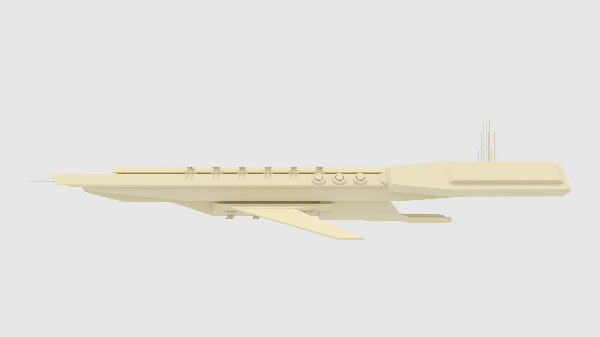 Es soll ein Jagdkreuzer sein. Ziel ist es nun, kleinere Schiffe zu bauen, die weniger Wartung benötigen, aber trotzdem die gleiche Kampfstärke haben wie größere Schiffe. Dieses hier ist mit einer Railgun ausgestattet. Zwar muss das komplette Schiff auf das Ziel ausgerichtet werden, doch wenn man die Durchschlagskraft bedenkt, ist dies nur ein kleiner Preis. Desweiteren besitzt dieses Schiff mehrere Torpedoabschussanlagen an der Front und mehrere Schnellfeuer Geschütze an den Seiten. Zudem einen Sechskernreaktor, dessen einzelnen Module im Notfall abgeworfen werden können. Es ist das erste Schiff dieser Klasse, das überhaupt einen Sechskernreaktor fassen kann. Die Technologie für die Reaktoren konnte entsprechend verkleinert und die Strahlung stark verringert werden. Die "Flügel" dienen hauptsächlich zur Abstrahlung von überschüssiger Wärme. Die Reaktoren können immerhin ziemlich warm werden...