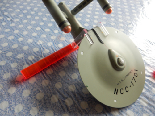 Entgegen der TV-Serien Modelle habe ich die Lichtquellen, die später Teile des Schiffchens beleuchten werden, sichtbar gemacht. Ich fand es irgendwie komisch, das es bei den TV-Modellen zwar Lichtkegel gab, aber keine dazu passenden Lichtquellen. Dafür gab es z.T. Lichtquellen an anderer Stelle, wo sie so gar keinen Sinn ergaben, wie zwischen der Plattierung der Triebwerke.