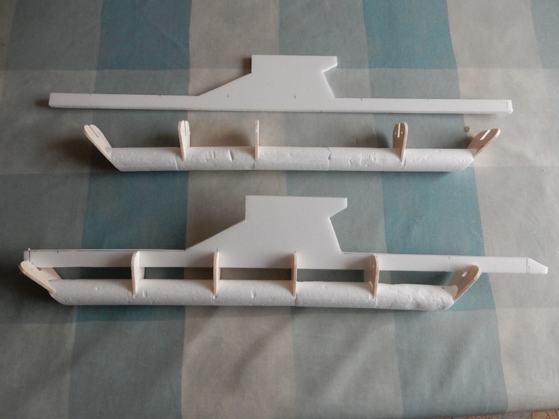 Nachdem ich gestern den ersten Testflug hatte und festgestellt habe, das ich extrem schwanzlastig bin, habe ich heute nachmittag das Heck aus Balsa aus dem Oberteil der Rumpfzelle geschnitten. Ich muss Gewicht hinten sparen. Das Balsaheck wog 22 gr. Das neue Heck aus 2mm Depron wiegt nur 10gr.