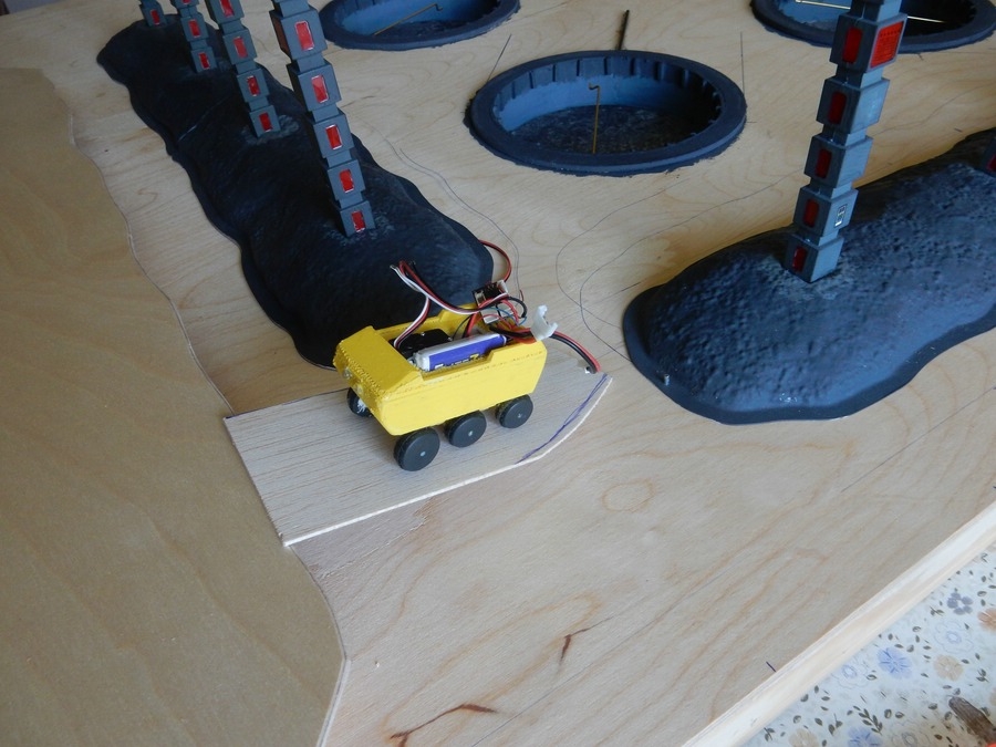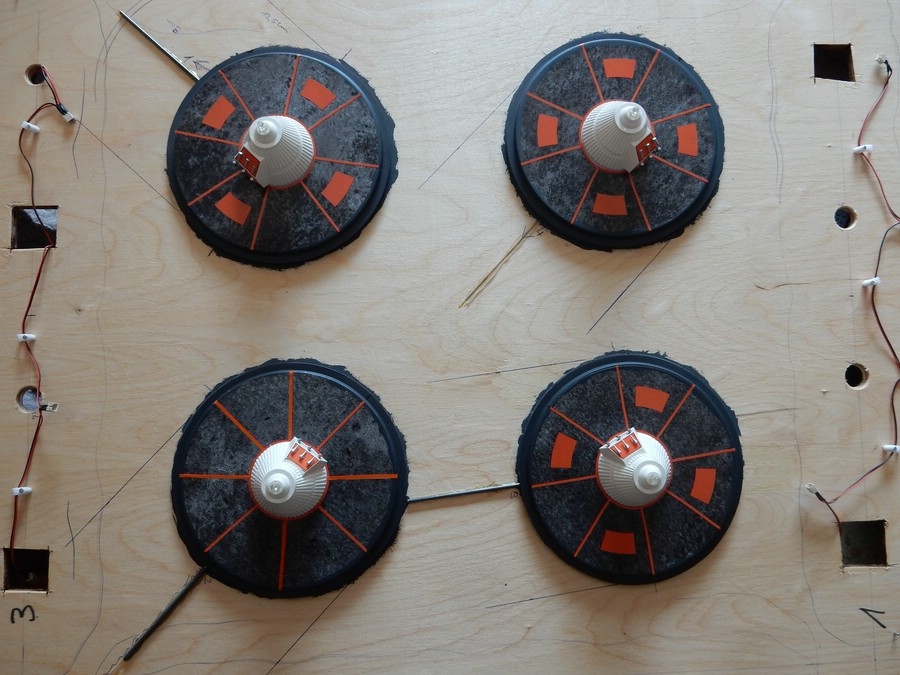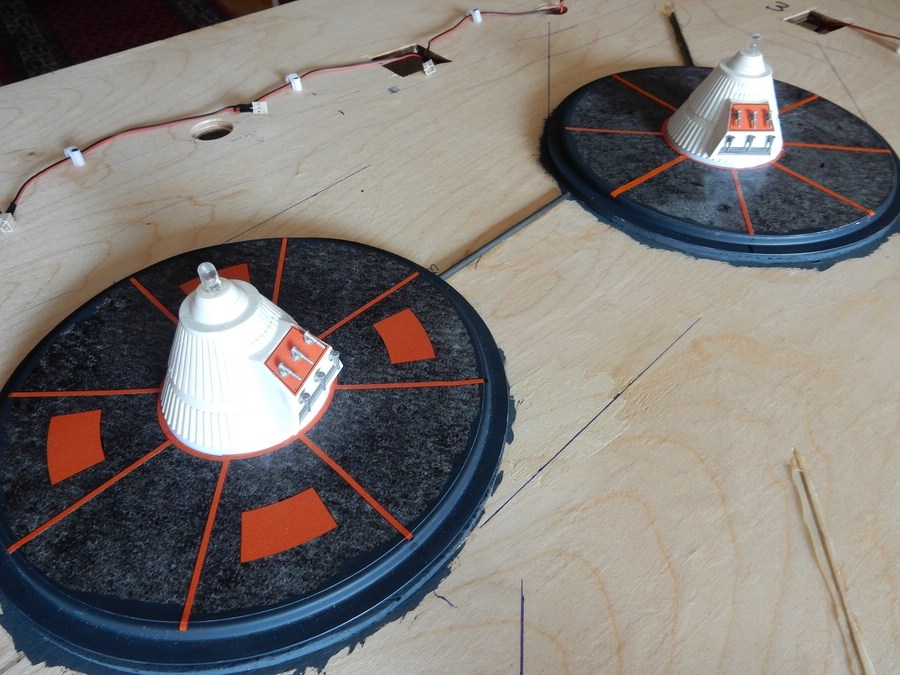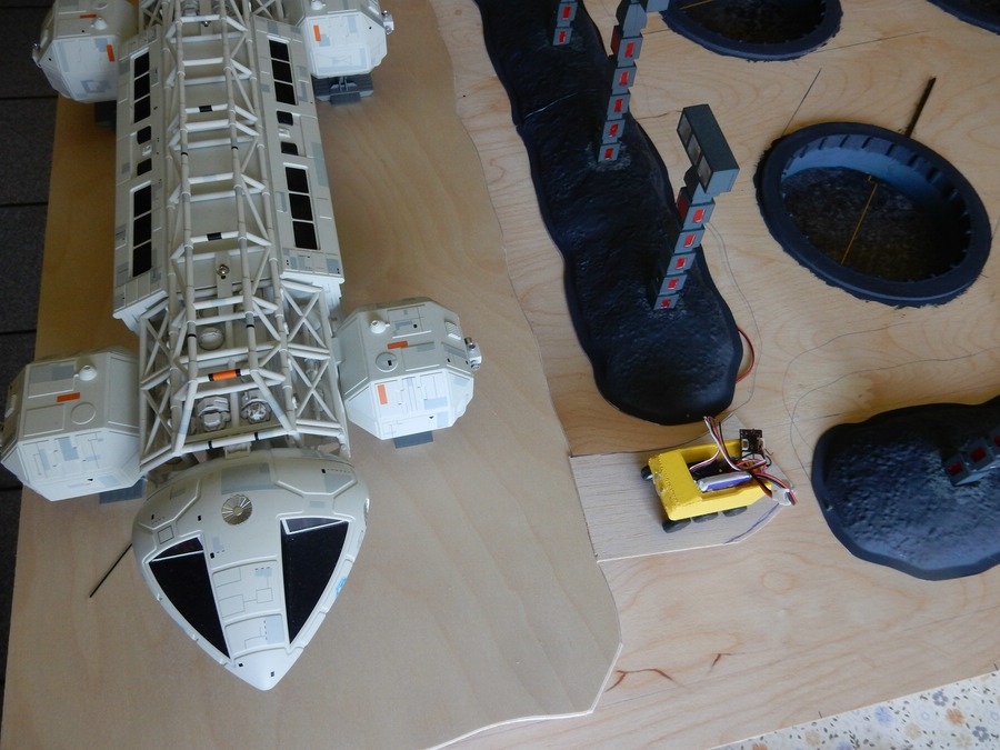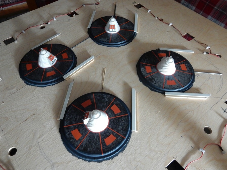 In den 4 Ecken sind die schwarzen Kästen. Diese sind für die Batterien der 16 Beleuchtungsmasten. Ebenfalls sieht man die 4 Servos mit eingehängtem Draht der durch den Ausguss in das Silo geht und dort im Ruderhorn eingehängt ist. Auch die Schalter zum schalten der vielen Beleuchtung sind fest eingebaut. Damit ist die Technik auf der Rückseite der Mondplatte komplett.