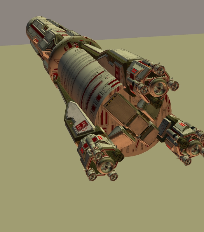 sodele..mal wieder zwischenstand.. römische Blechdose jetzt mit Sensorik(vorne) und schonmal begonnener neuer Textur..grade der Heck/Triebwerksbereich ist ziemlich aufwendig,ich glaub ich habs bischen übertrieben mit den triebwerkdeteils