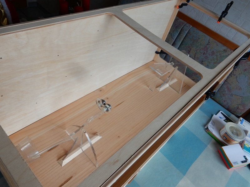 Hier mal ein paar Bilder der Vitrine. Ein Bild zeigt die Rückwand mit den 3mm Bohrungen. Da werden die 3mm Leds eingeklebt. Die Vitrine ist 70 cm breit, 30 cm tief und 30 cm hoch.