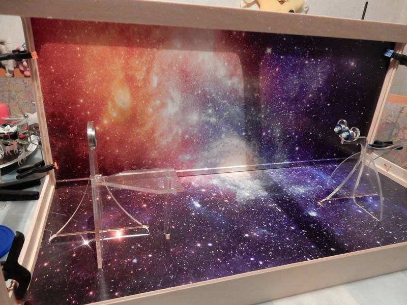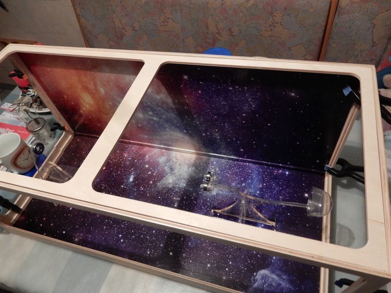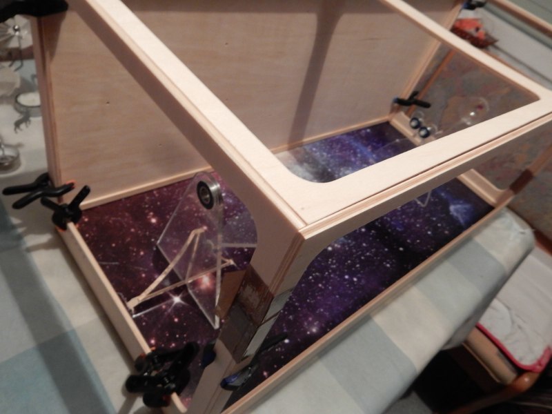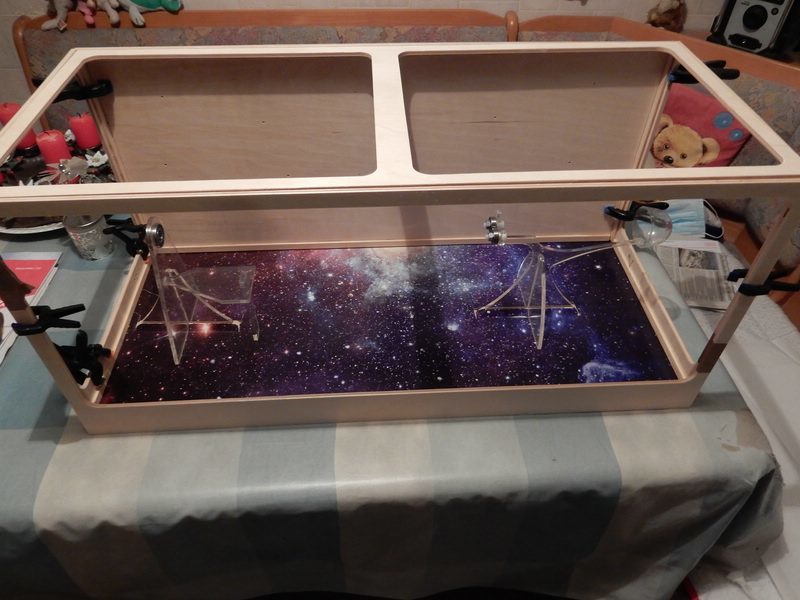 Ich werde die Vitrine von aussen weiss bügeln. Von innen kommt eine selbstklebende Weltraumtapete drin. Dadurch ist es innen schon relativ duster. Ebenfalls kommen 3mm tranparente grau getönte Plexiglasscheiben in der Vitrine. Tapete ist zur Zeit unterwegs. Ein paar 3mm Leds werden ebenfalls noch eingebaut. das soll ferne Sterne simulieren.