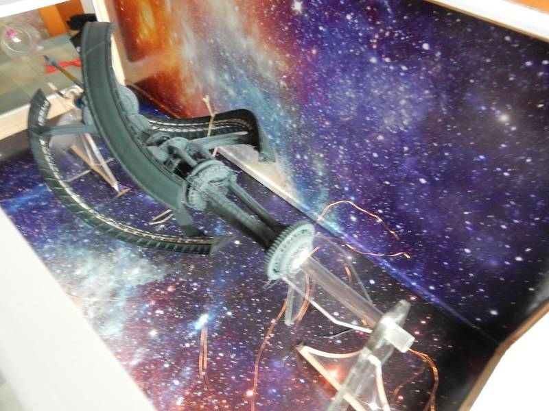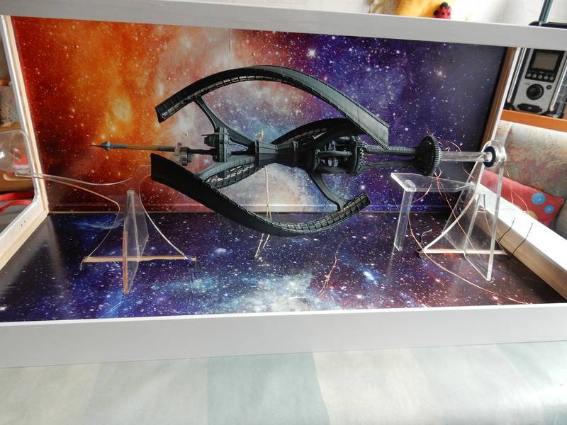 Jetzt muss ich sehen, das ich die ganzen Kupferlackdrähte die an der Avalon hängen richtig anschliesse. Da die Avalon sich in der Vitrine langsam drehen soll, werde ich wohl mit Schleifringen arbeiten müssen.