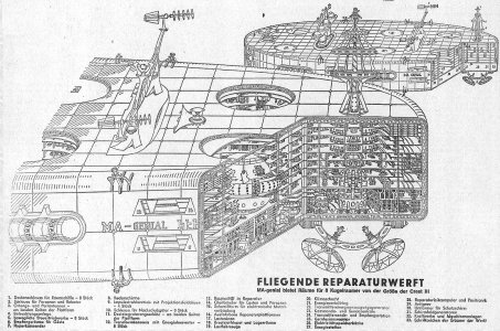 Es gibt bei PR naürlich auch grosse Werfen in dehnen umfangreiche Reparaturen durchgeführt werden. Dazu werden die Schiffe in die Werft navigiert, wo dann auch von verschiedenen Stockwerken aus an den Schiff gearbeitet werden kann. Bei Perry Rhodan ist der irdische Mond eine gewaltige Raumschiffsfabrik, in der Schlachtschiffe in riesigen Hallen "am Band" produziert werden. Dazu wurde praktisch der gesamte Mond ausgehöhlt und mit technischen Anlagen versehen.
