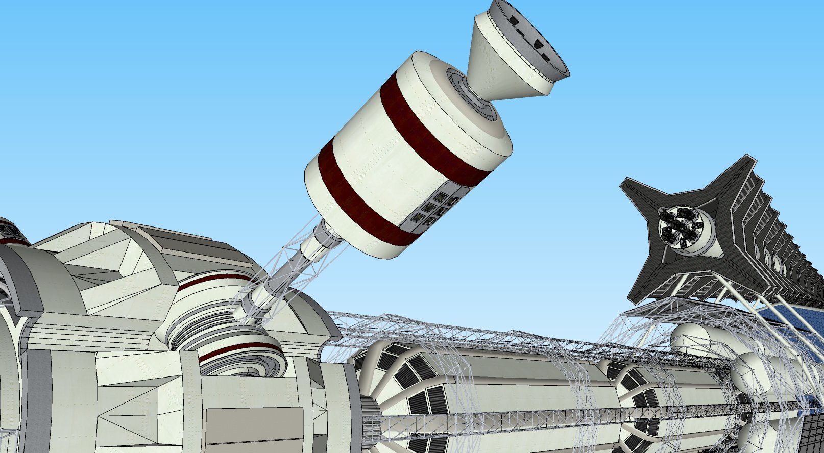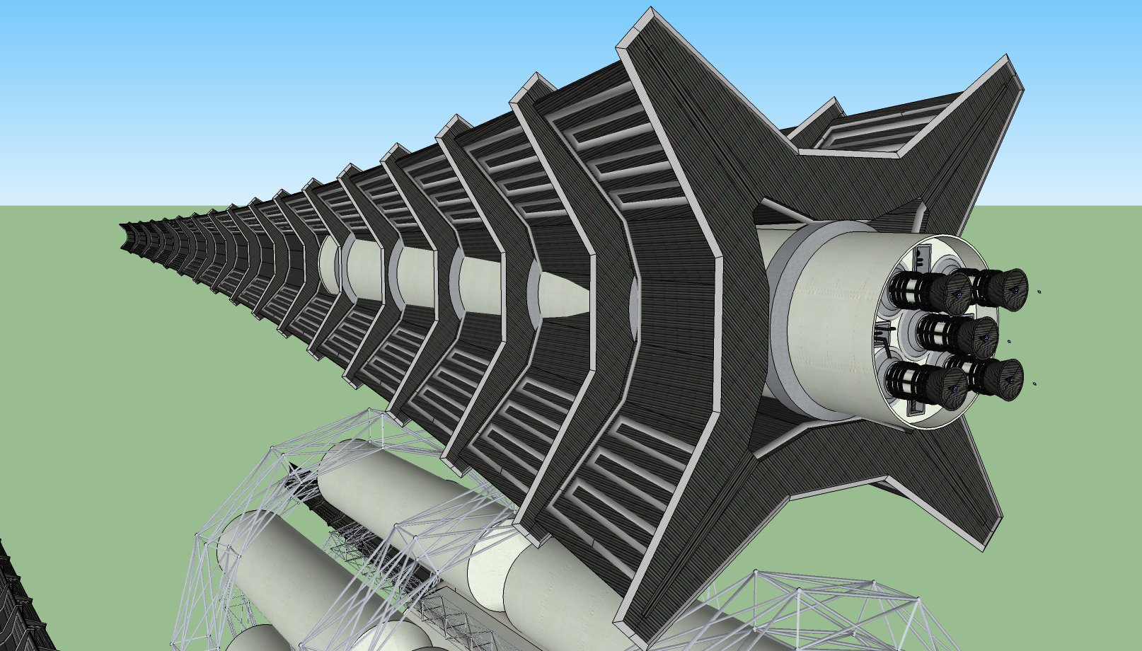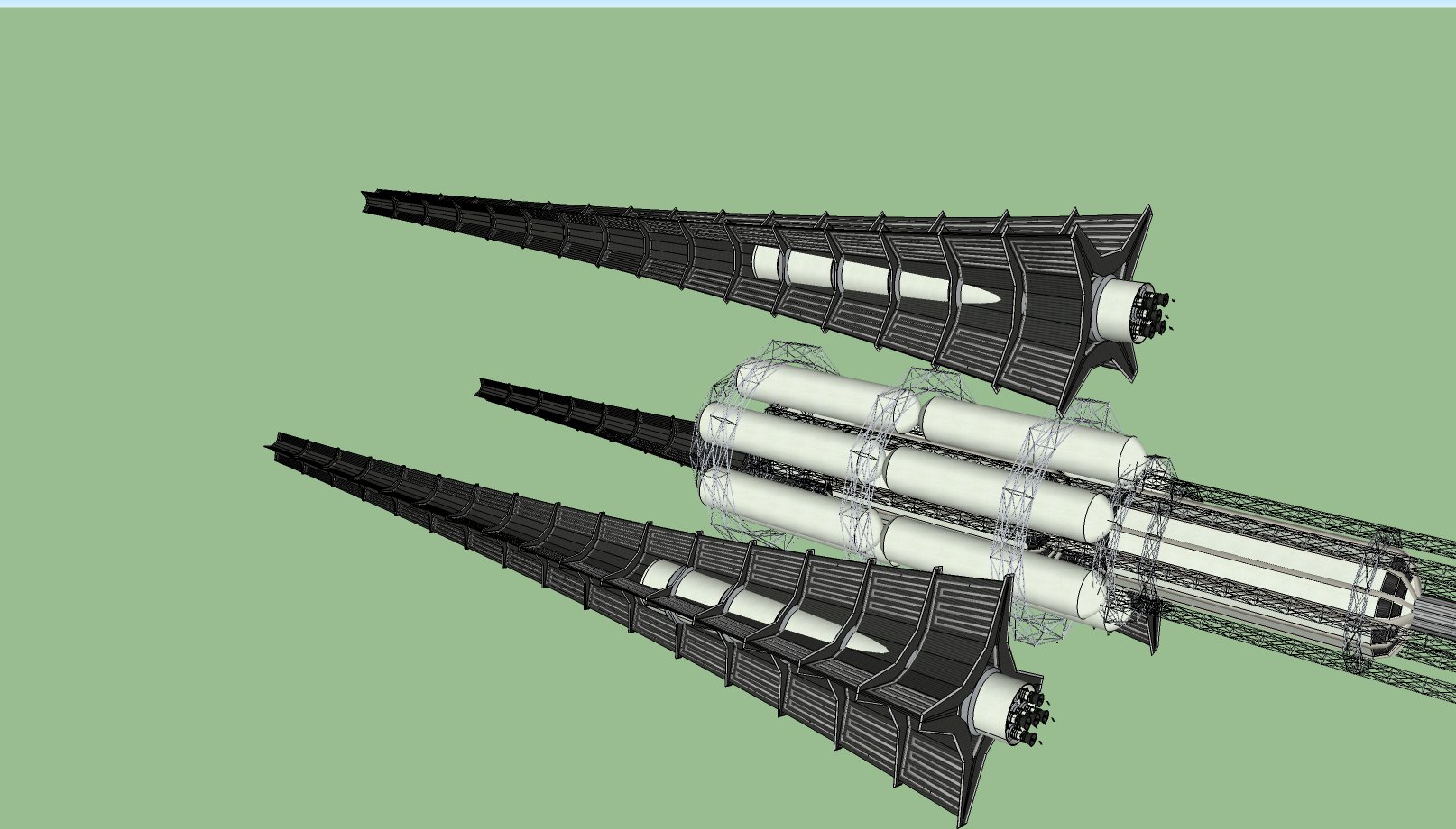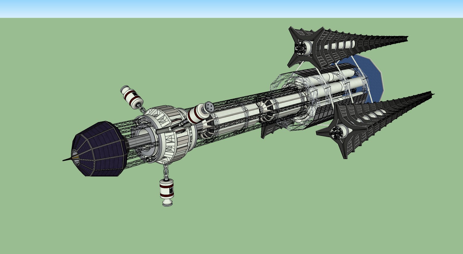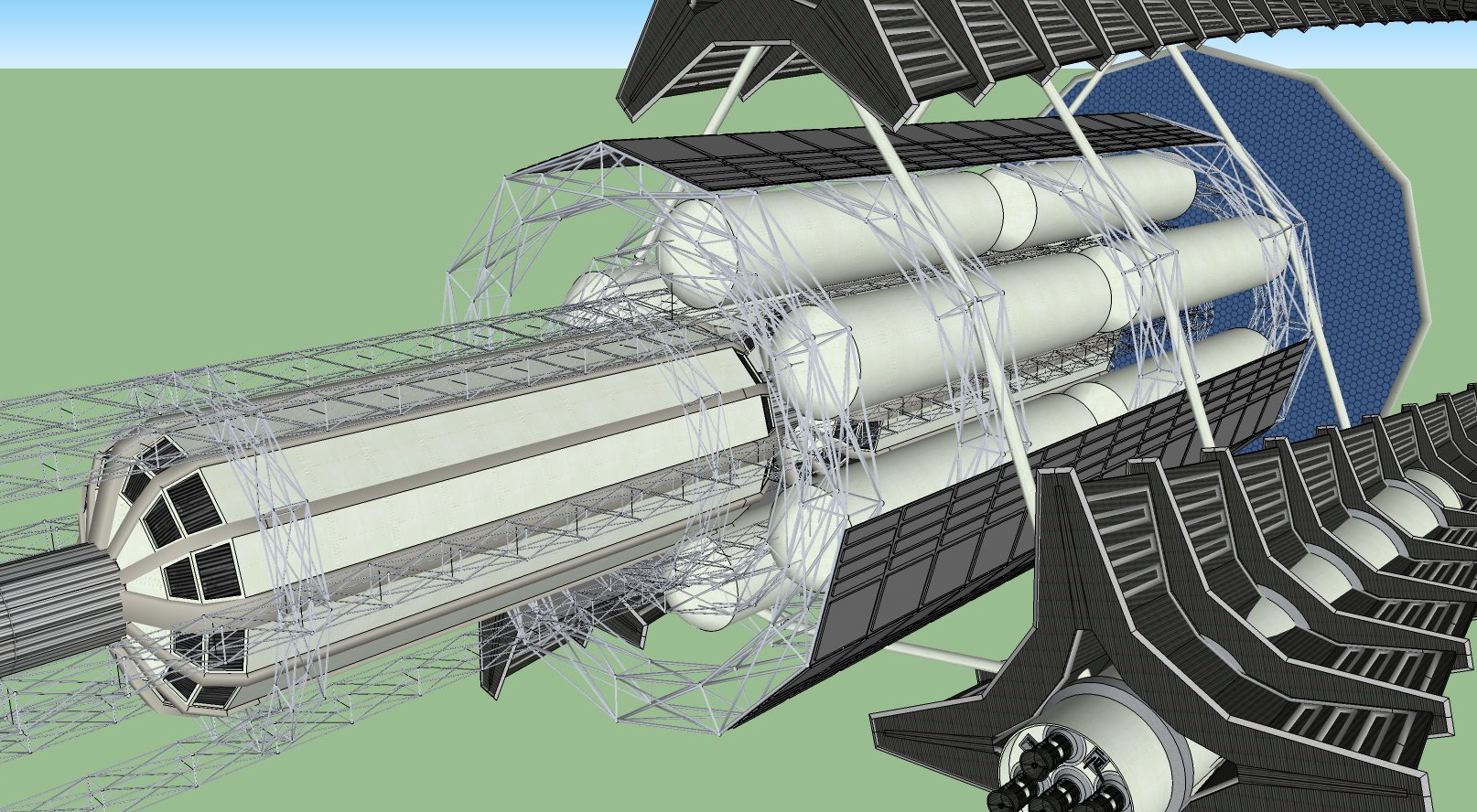 Ein realistisches Raumschiff könnte dann z.B. so aussehen, dass du ein Trägergitter hast, vorne dran das Nutzlast-Modul mit Wohnräumen, Cockpit und Lander, hinten dran das Kraftwerk und der Antrieb, und dazwischen ein bis sechs 100t-Treibstoff-Tanks. Etwas von der Art: