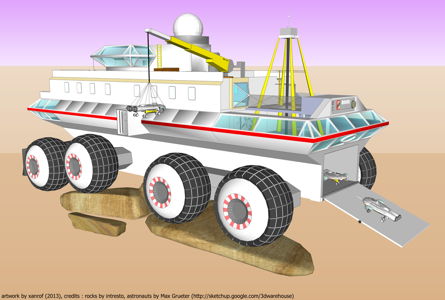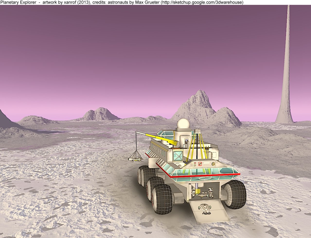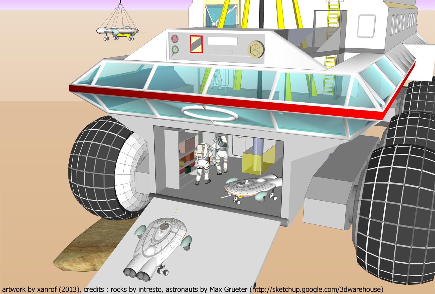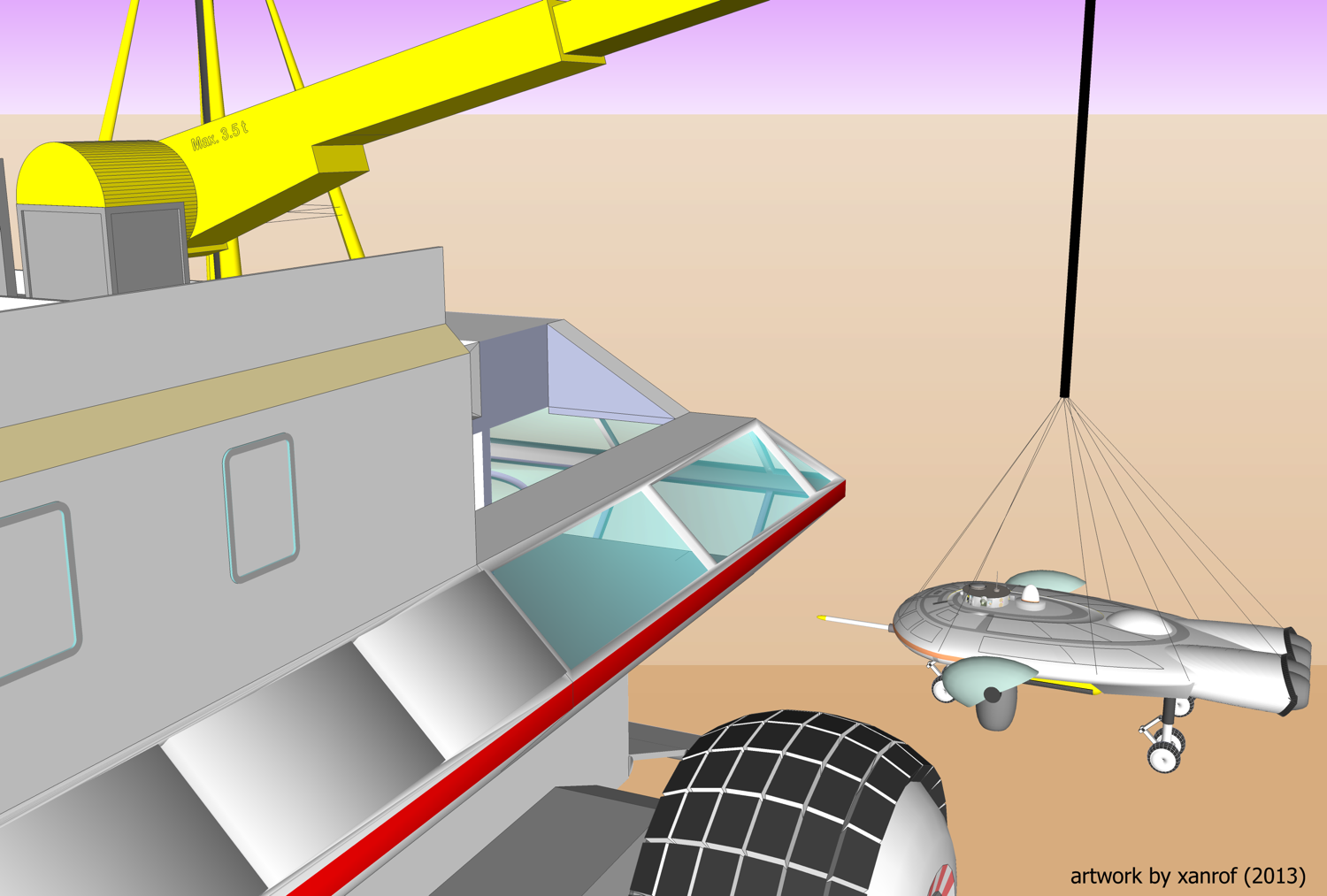 Allerdings haben es mir -zur Zeit- nicht die grossen, interstellaren Raumschiffe angetan (wie man sie hier findet), sondern eher das, was sich auf anderen Planeten, Monden oder Asteroiden in relativer Bodennaehe befinden oder bewegen kann.