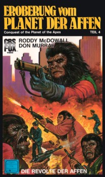 Der vierte Teil der „Plant der Affen“-Saga – diesmal inszeniert von John Lee Thompson – entfernt sich gänzlich vom Auftakt der „Affen“-Serie und schildert den vom Affen Cornelius in Teil 3 vorausgesagten Beginn der Affenrevolution. (Quelle)