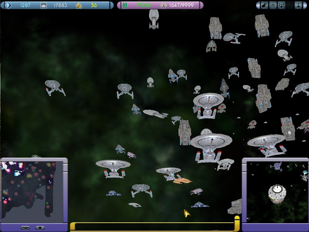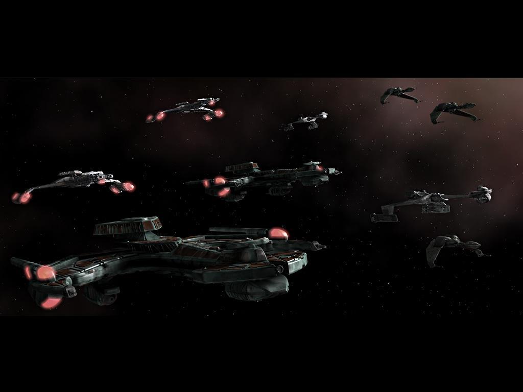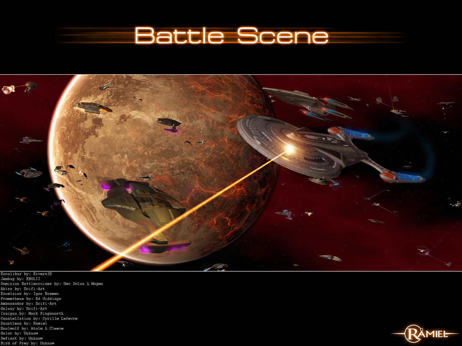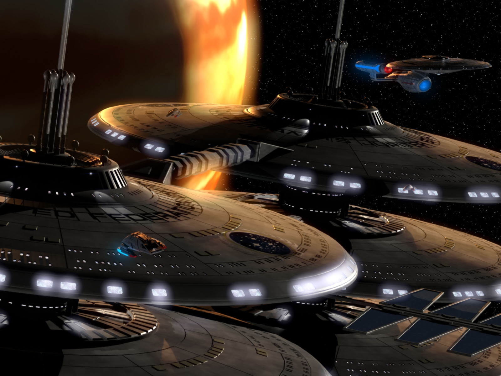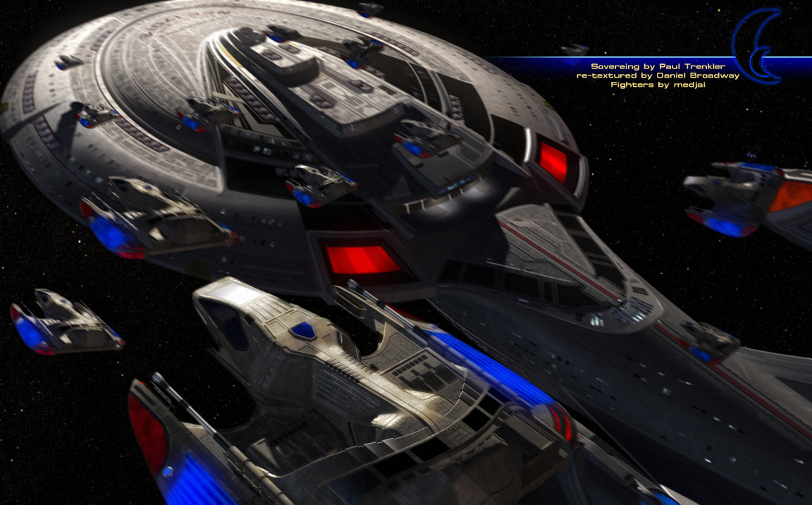 Das große Schiff auf der rechten Seite ist eine Art Sternenflottenflugzeugträger (der Name der Klasse fällt mir nicht mehr ein) und besitzt eine große Anzahl der neuen und viel kleineren Sternenflottenjäger der Valikry Klasse (ich bin mir nicht sicher ob es so richtig geschrieben ist). Jedenfalls sind die Jäger und das Schiff absolut Non-Canon aber eine super Ergänzung der Sternenflottenarmada.