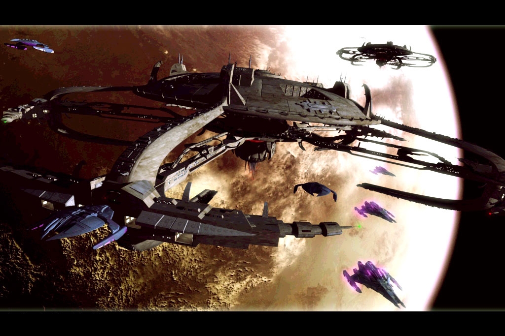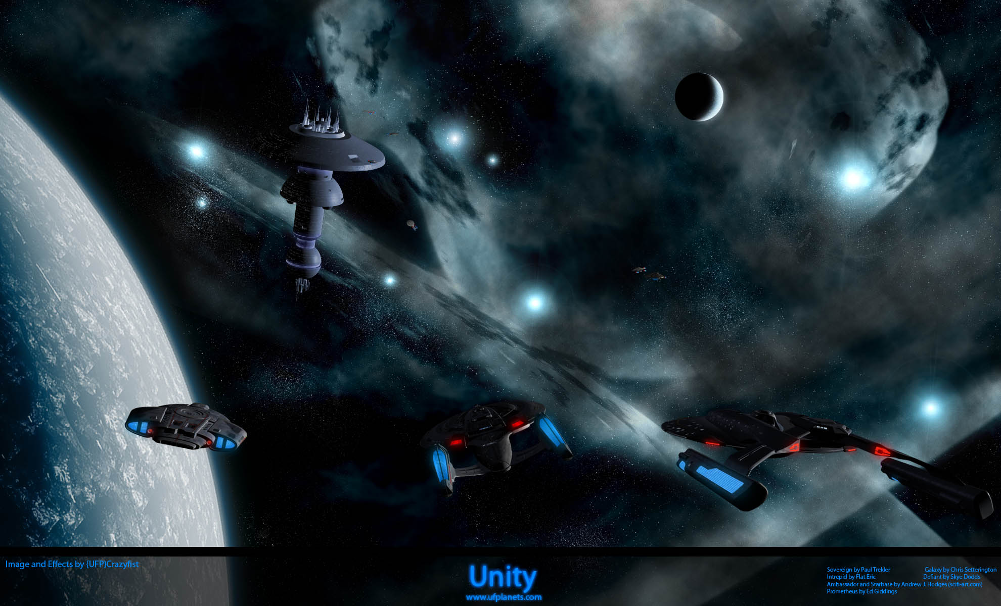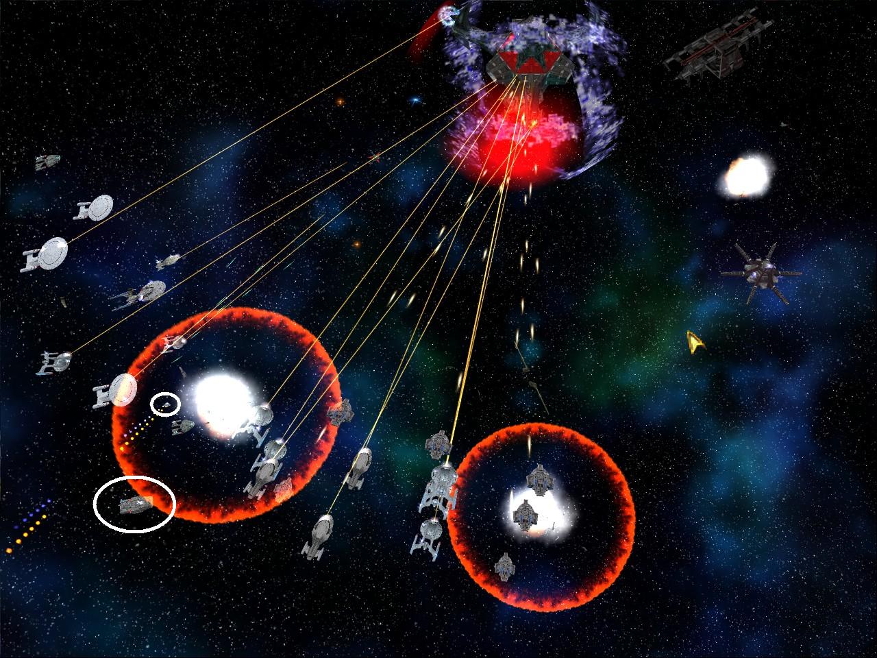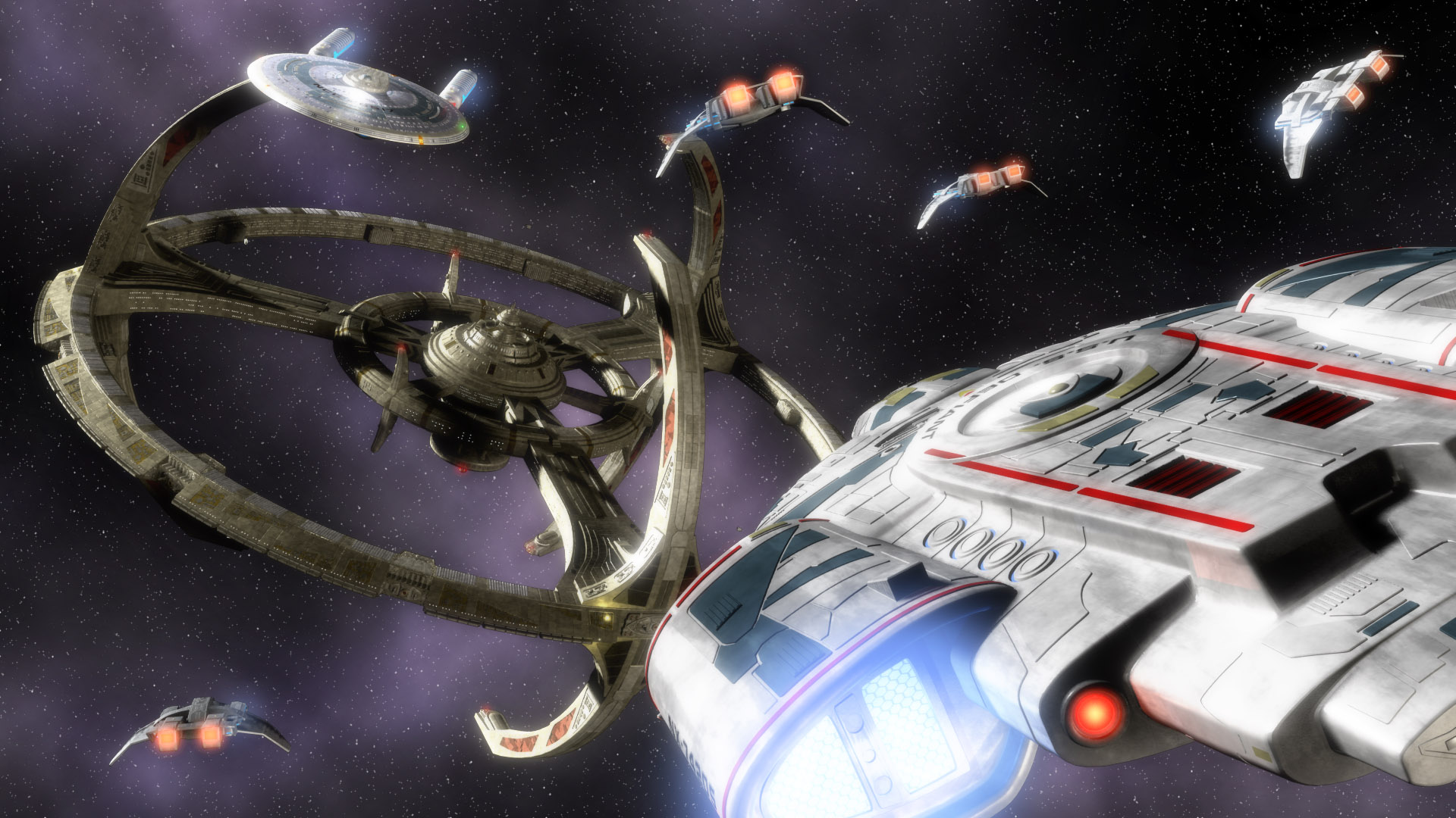 Das große Schiff auf der rechten Seite ist eine Art Sternenflottenflugzeugträger (der Name der Klasse fällt mir nicht mehr ein) und besitzt eine große Anzahl der neuen und viel kleineren Sternenflottenjäger der Valikry Klasse (ich bin mir nicht sicher ob es so richtig geschrieben ist). Jedenfalls sind die Jäger und das Schiff absolut Non-Canon aber eine super Ergänzung der Sternenflottenarmada.