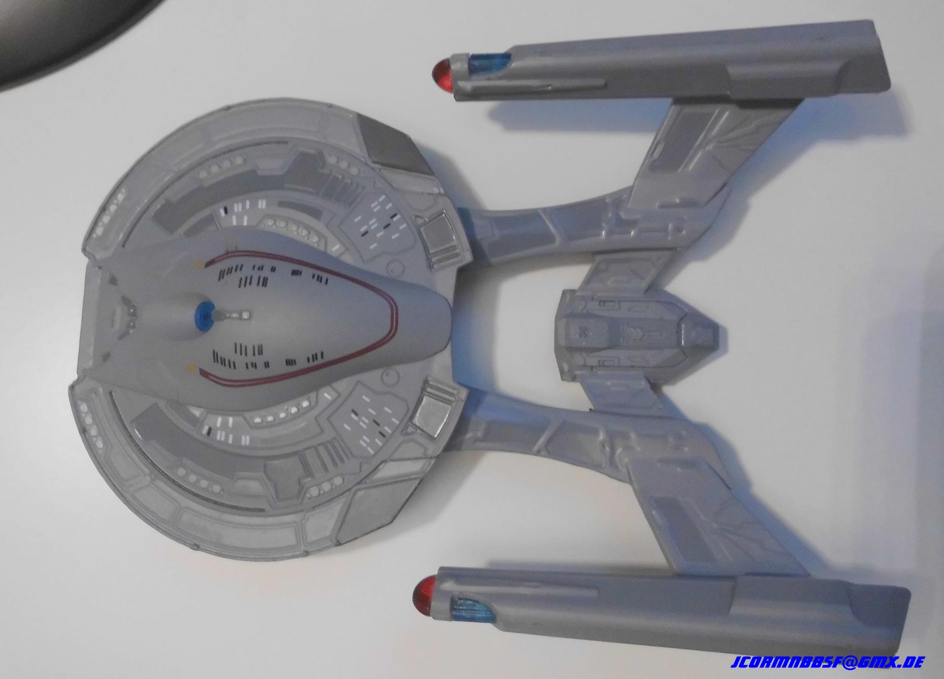 Bei der Voyager ist die deutsche Version deutlich glänzender. Am stärksten fällt das beim Sticker vor dem shuttlehangar auf. Brittische Version ist matt und glänzt null. Deutscher Sticker schillert richtig. Die beiden orangenen Bemalungen oben ganz vorne an der Spitze sind beim deutschen Modell missraten, aber das kann bei anderen deutschen besser sein. Meine ist zu lang und schief und zu weit vorne. Bei der brittischen perfekt. Dass die Fenster nicht perfekt bemalt sind, ist bei beiden ähnlich, fällt aber bei der Größe gar nicht auf. Allerdings sind auch die roten Markierungen um die Phaserphalanxen bei der deutschen Version schlechter getroffen als bei der brittischen, aber auch das kann nur bei meiner deutschen der Fall sein.