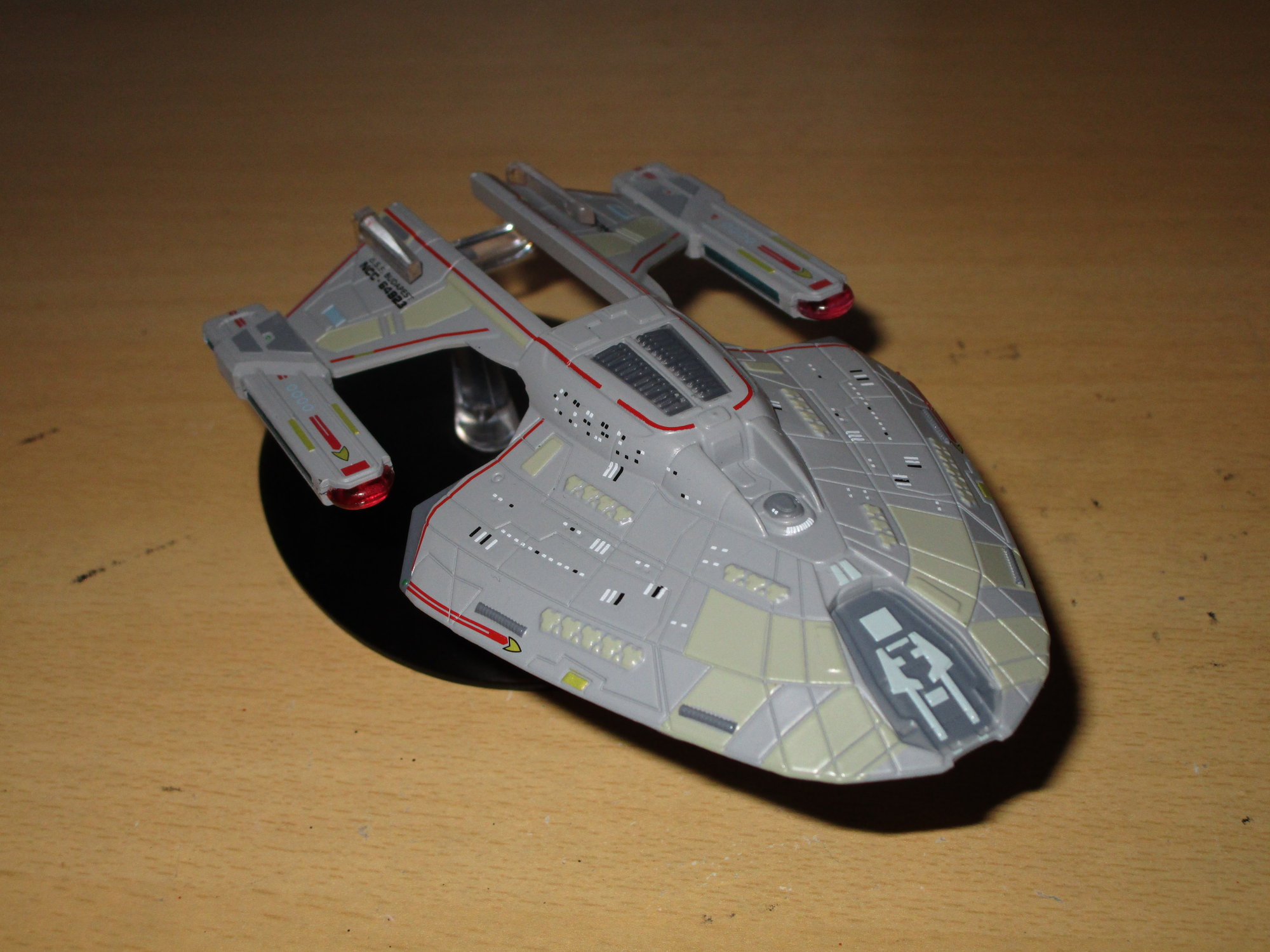 Meine Norway Klasse ist gestern gekommen und die sieht echt Top aus. Selbst die Shuttlehanger unter den Pylonen der Warpgondeln sind gut bemalt. Einzig der Ständer war zumindest bei mir bescheuert konstruiert, so das das Schiff immer wieder raus gerutscht ist. Hab dann einfach ein anderes Unterteil eines Ständers getauscht und nun hält das Schiff auch.