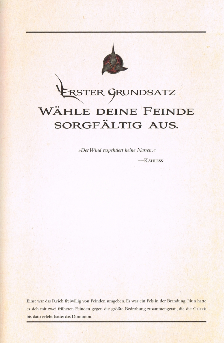 Fazit: Dass dieses Buch Teil der offiziellen Roman-Kontinuität ist hat mich auch eine Weile davon abgehalten, es zu lesen. Ich hatte es mir schon kurz nach Erscheinen gekauft, Ende 2014 oder Anfang 2015, doch damals arbeitete ich schon an meinem Fan-Roman "Sailing on Forbidden Seas", der sich nicht an der in den offiziellen Romanen etablierten Kontinuität orientiert und sich ebenfalls sehr stark mit der klingonischen Kultur und Geschichte beschäftigt. Um mich nicht beeinflussen zu lassen, blieb "Die klingonische Kunst des Krieges" – das sich natürlich unverkennbar an Sun Tzus "Die Kunst des Krieges" orientiert – also eine Weile im Regal, doch in den vergangenen Wochen habe ich mir Grundsatz für Grundsatz vorgenommen und fand vor allem die Geschichten sehr unterhaltsam und interessant. Querbeet enthält das Buch Erzählungen von Begebenheiten aus der klingonischen Mythologie, von Kahless, den Regentschaften verschiedener Imperatoren und Kanzler, aber auch Geschichten über einfache Leute.