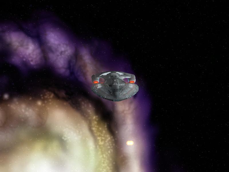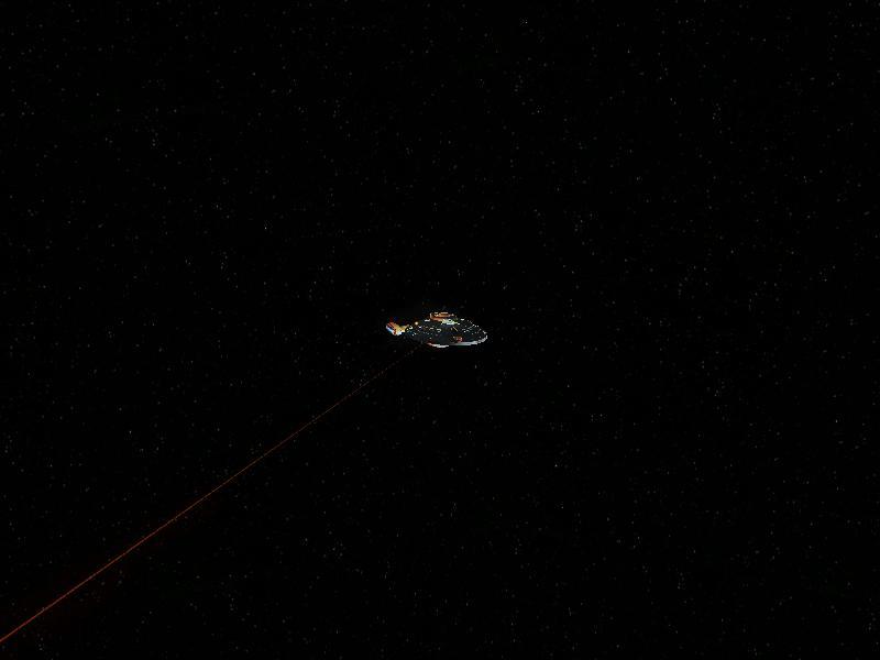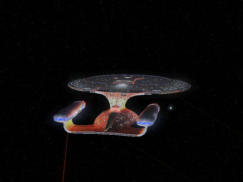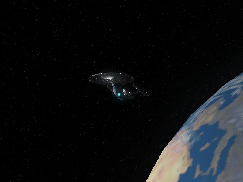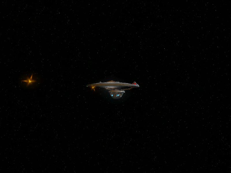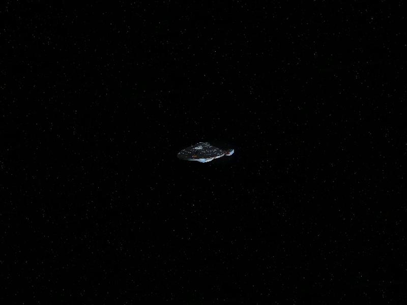 Bei dem dritten Bild mit der Sovereign ohne Licht, hatte ich den Silent Running Mode aktiviert, wo die Energie aller Systeme auf mindestens zwanzig Prozent heruntergestellt wird. Zudem werden die Lichter (wie man gut auf dem Bild sehen kann) und der Warpkern, der sonst für die Energieversorgung zuständig ist, abgeschaltet und nur noch Energie von den Batterien genutzt. Durch diesen Modus kann man sich bei brenzligen Situationen verstecken bis alles vorüber ist, oder es als Hinterhalt für den Gegner nutzen, indem man, wenn der Gegner seine schwächste Seite zeigt und gar nicht damit rechnet, den Modus deaktiviert und die volle Breitseite aller Waffen auf ihn loslässt.