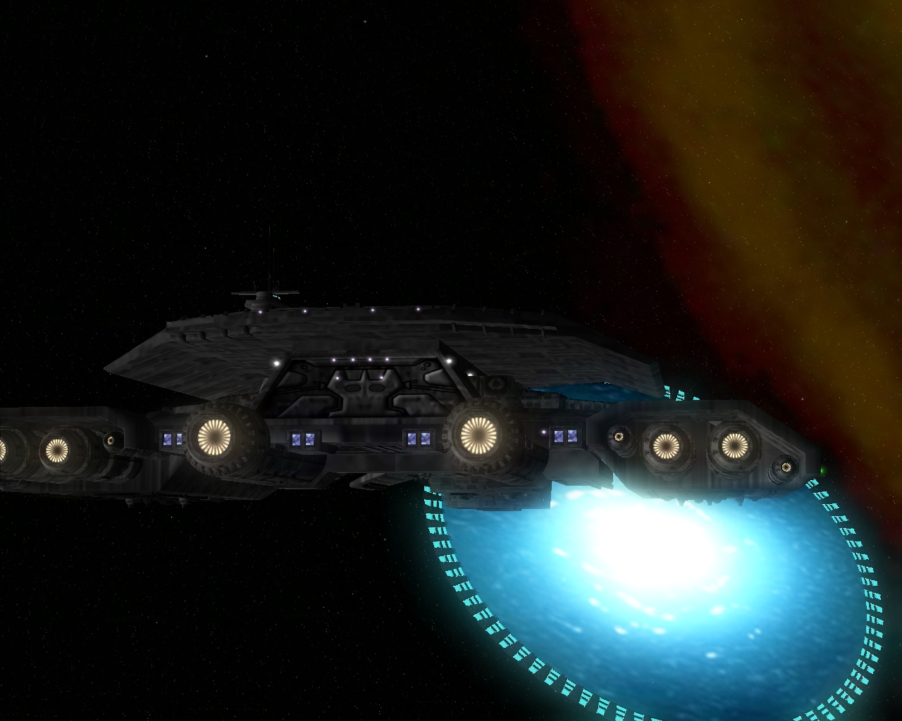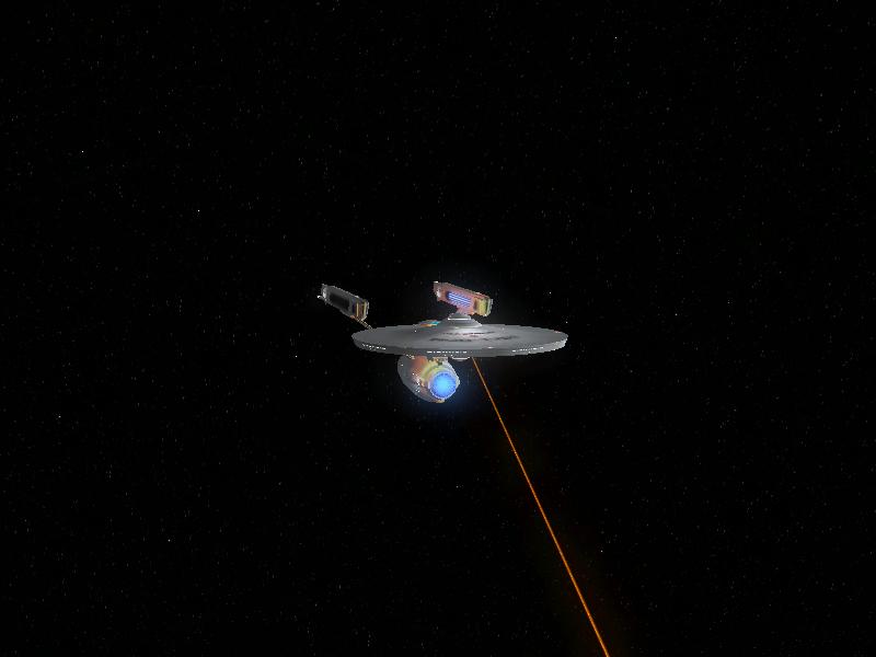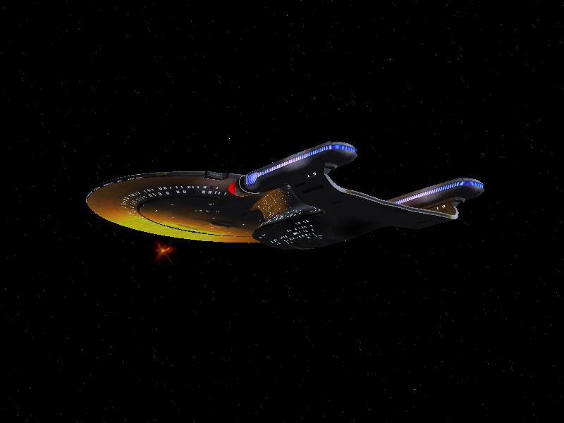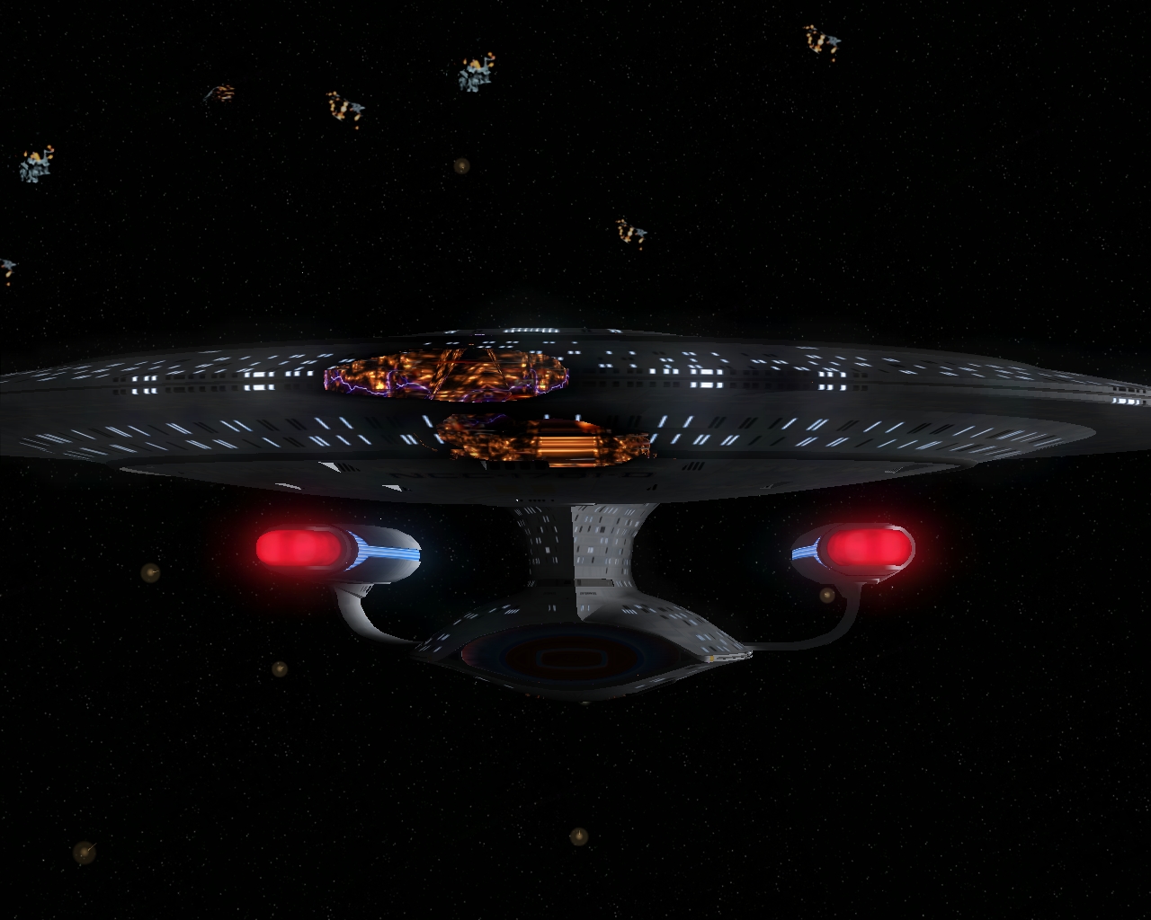 Bei dem dritten Bild mit der Sovereign ohne Licht, hatte ich den Silent Running Mode aktiviert, wo die Energie aller Systeme auf mindestens zwanzig Prozent heruntergestellt wird. Zudem werden die Lichter (wie man gut auf dem Bild sehen kann) und der Warpkern, der sonst für die Energieversorgung zuständig ist, abgeschaltet und nur noch Energie von den Batterien genutzt. Durch diesen Modus kann man sich bei brenzligen Situationen verstecken bis alles vorüber ist, oder es als Hinterhalt für den Gegner nutzen, indem man, wenn der Gegner seine schwächste Seite zeigt und gar nicht damit rechnet, den Modus deaktiviert und die volle Breitseite aller Waffen auf ihn loslässt.